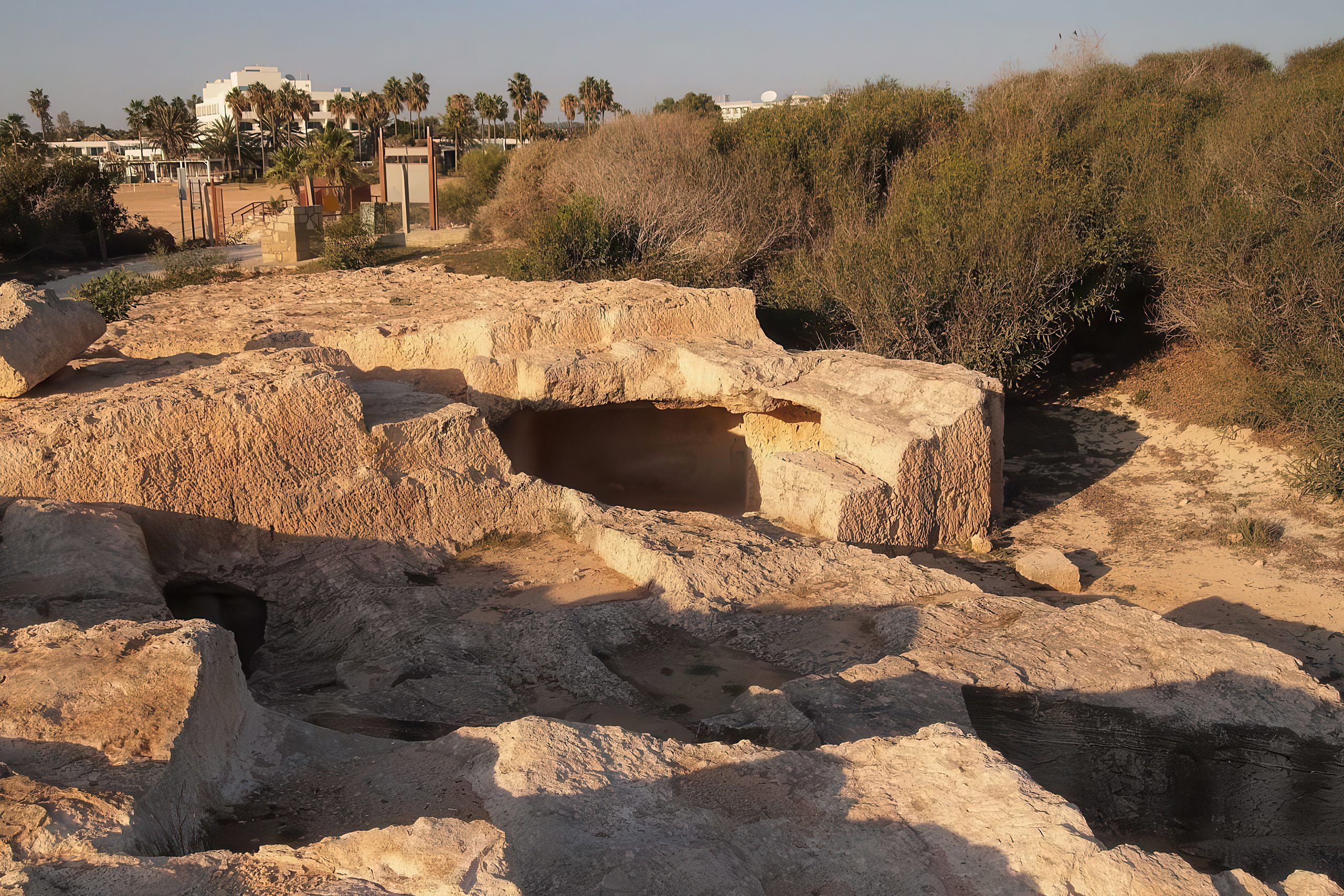 The Makronissos Tombs are located on a headland between Makronissos Beach and Nissi Beach, just west of Ayia Napa. The site is open year-round except on public holidays, with free entry. Visitors can walk down into many of the chambers and see the carved benches and central trenches firsthand.