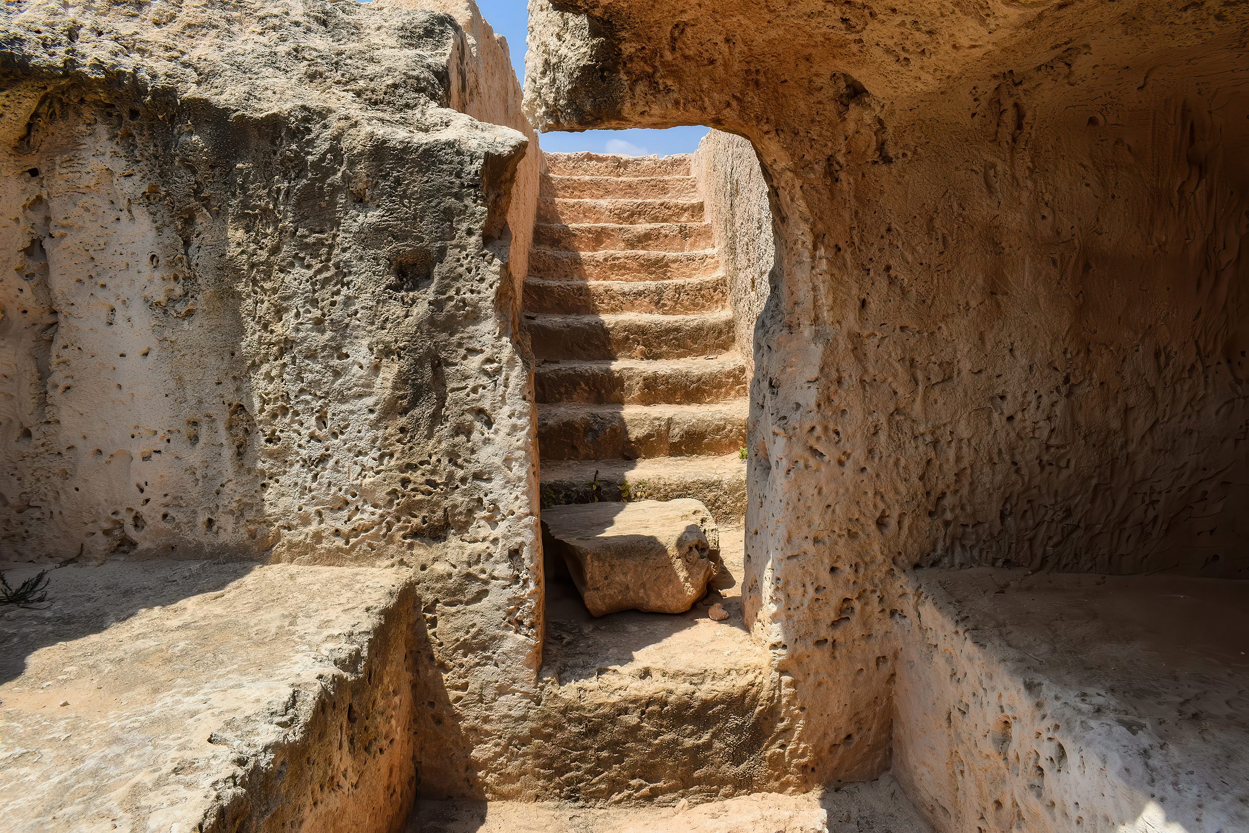Most of the chambers follow an identical design. A stepped road, called a dromos, descends from ground level to a rectangular entrance. Workers originally sealed these entrances with one large calcarenite slab or two smaller ones. The chambers themselves are simple but functional.