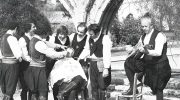 The shaving of the groom takes place at his childhood home usually on the eve of the wedding day. The groom’s best man or koumbaros shaves his face with a razor while friends and relatives sing traditional songs and tease him. The shaving symbolizes his transition from boyhood to manhood and readiness to take on his new role as husband. A professional barber shaves the groom while the best man holds the towel and helps. Gathered relatives, friends, and guests gift the barber and musicians by placing money in a plate in front of them.