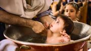 During baptism, the godparent with the baby in their arms stands at the baptismal font and repeats whatever the priest instructs. The priest takes the child and immerses him three times. Then the priest cuts the child’s hair crosswise on each side of the head, cutting small strands that symbolize obedience to the Lord. Cropped hair is a sacrifice the child makes to God for giving new spiritual life.