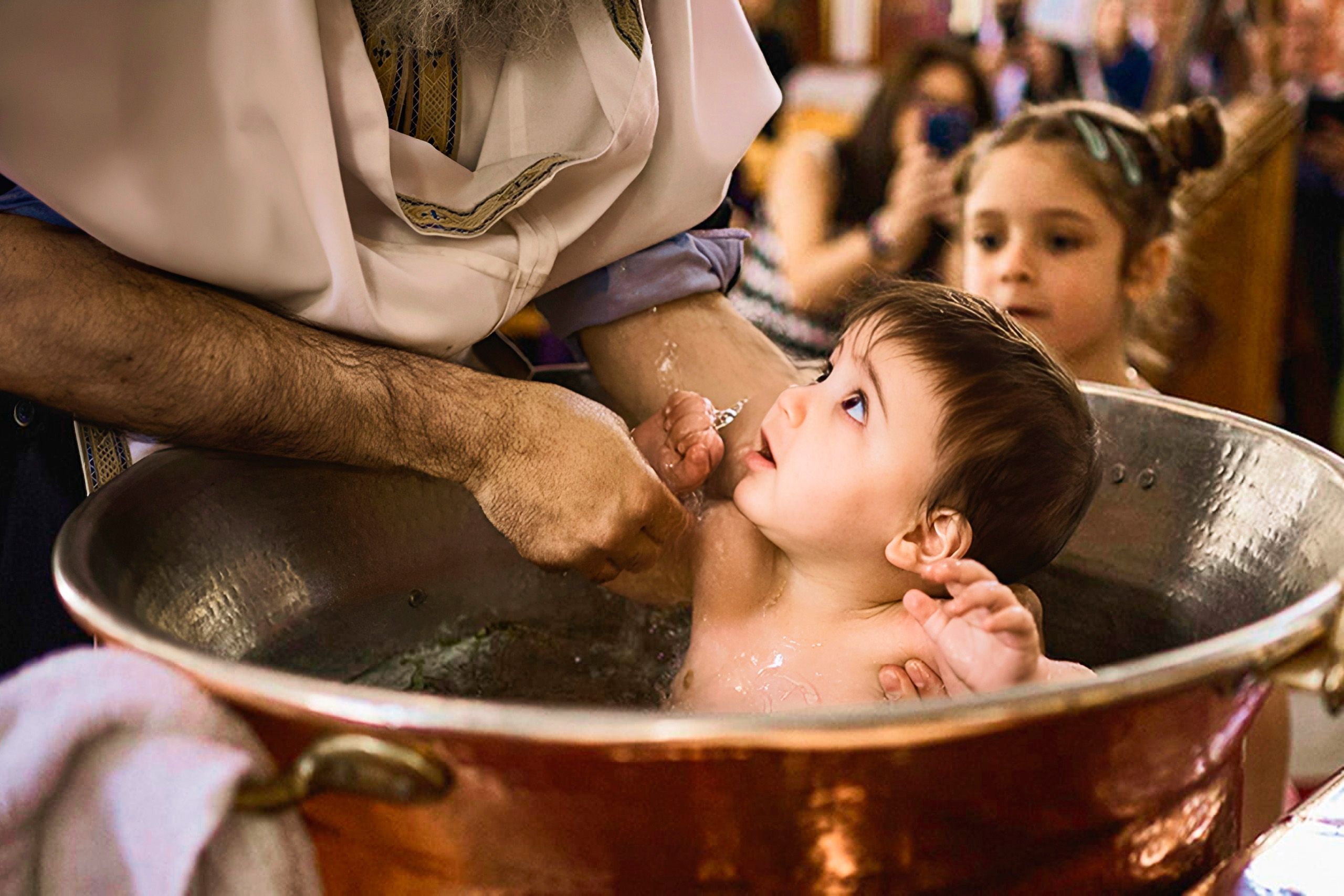 Orthodox baptism combines two sacraments: baptism itself through triple immersion in holy water and chrismation through anointing with holy oil. The godparent holds significant responsibilities, preparing the baptismal dowry including a large candle, baptismal clothes, towels, sheets to wrap the baby, a baptismal cross for the child, and small crosses called martirika for all who witness the sacrament.