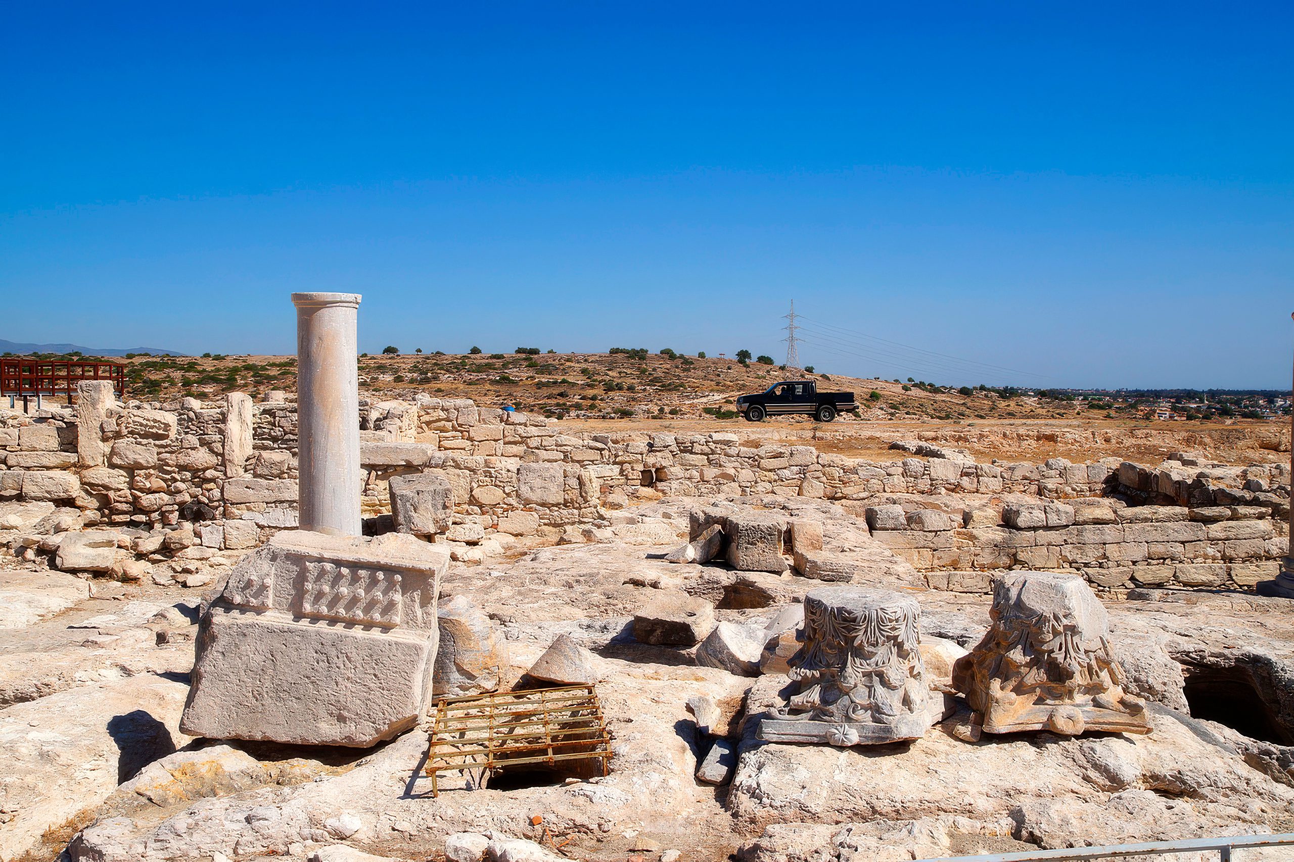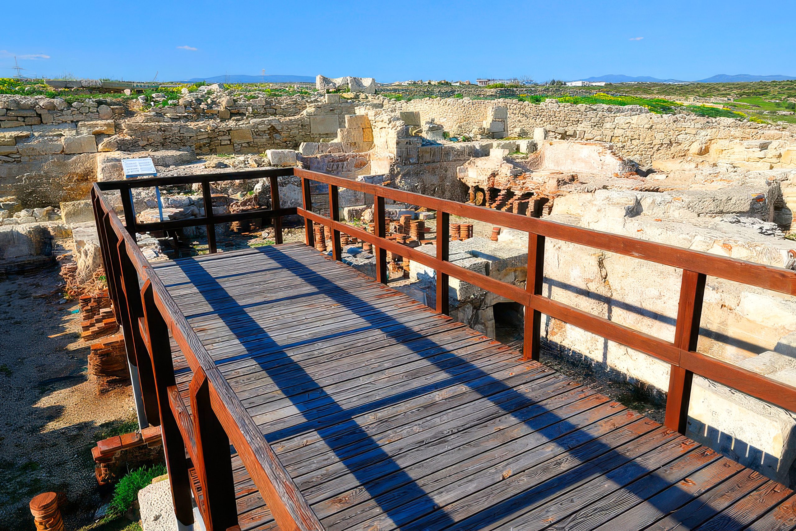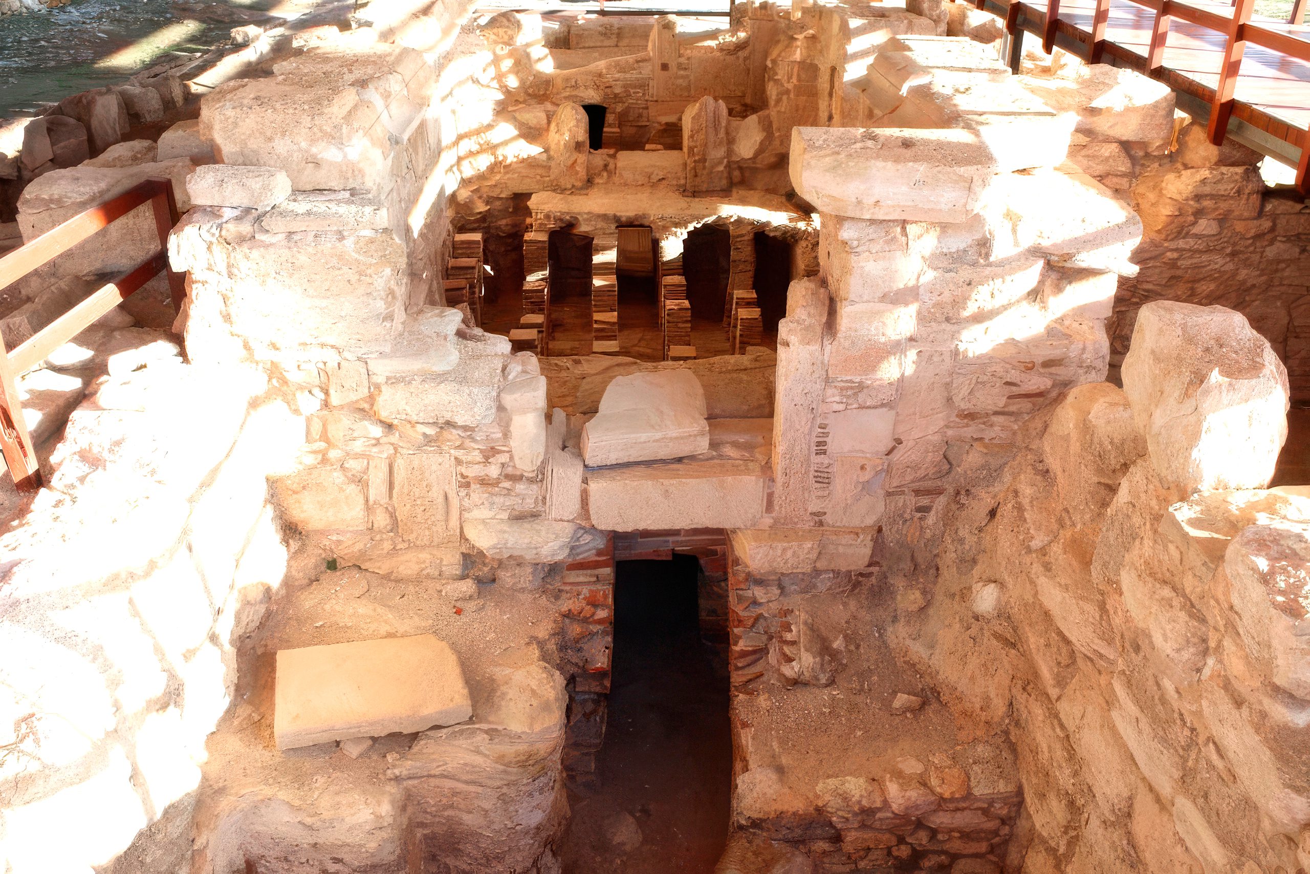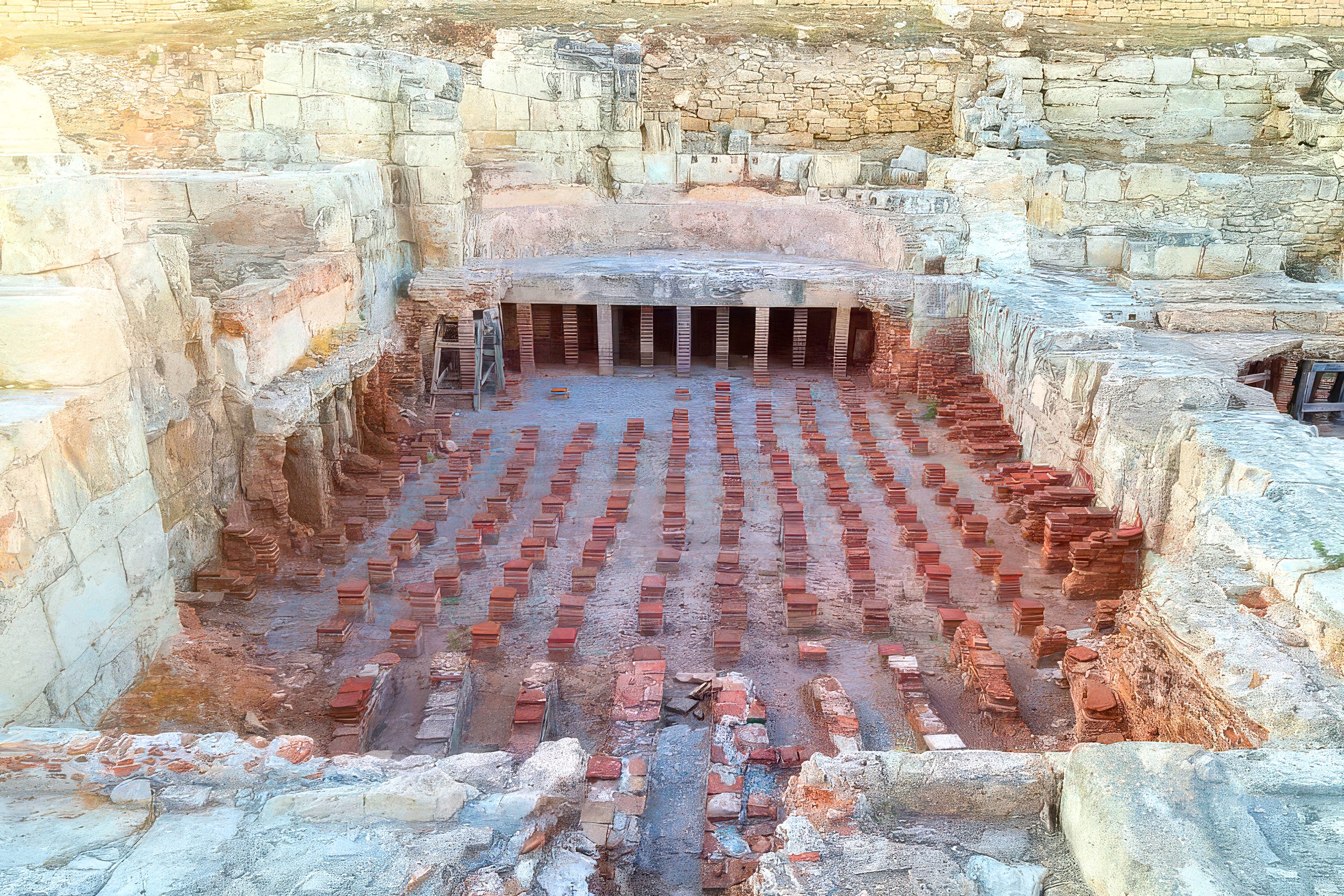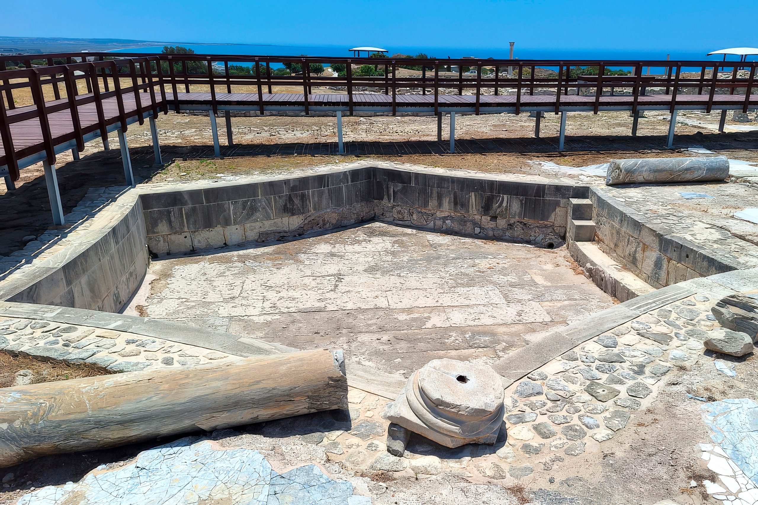 Modern visitors to Kourion can walk over the substantial remains of the nymphaeum and bath complex on raised wooden walkways. The foundations clearly show the layout of different rooms and the progression of construction phases. The bases of the pyramidal building dating from 375-350 BC are visible east of the hexagonal pool. These represent the earliest architectural remains found at Kourion, predating even the Hellenistic structures.