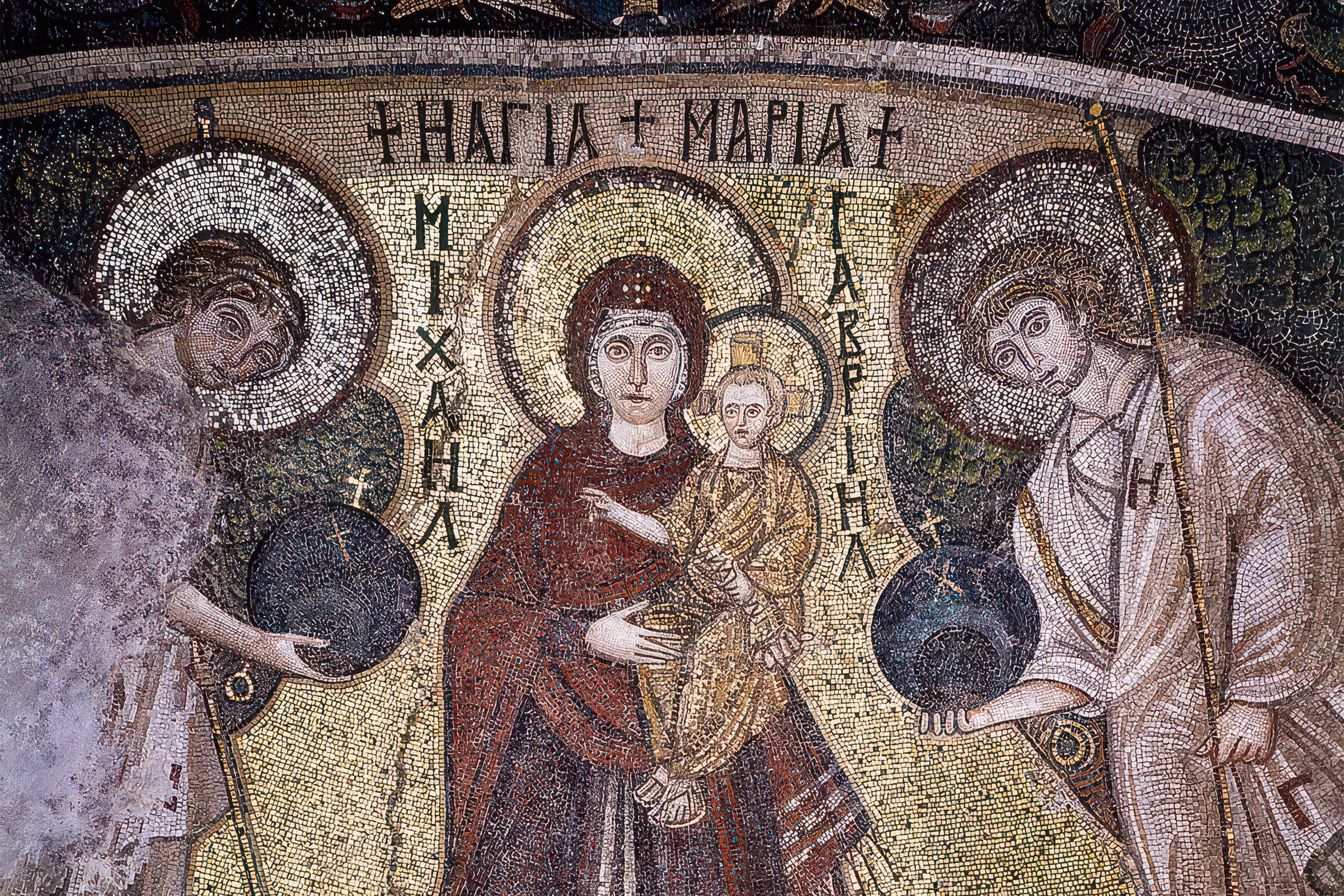The 6th century wall mosaic on the half-dome over the sanctuary apse is considered one of the most significant wall mosaics of early Christian art. The mosaic depicts the Virgin standing on a gold background, holding baby Jesus in her left arm, with the Archangels Michael and Gabriel on either side, and represents the oldest surviving monumental representation of this type of Virgin, the Panagia Vrefokratousa.