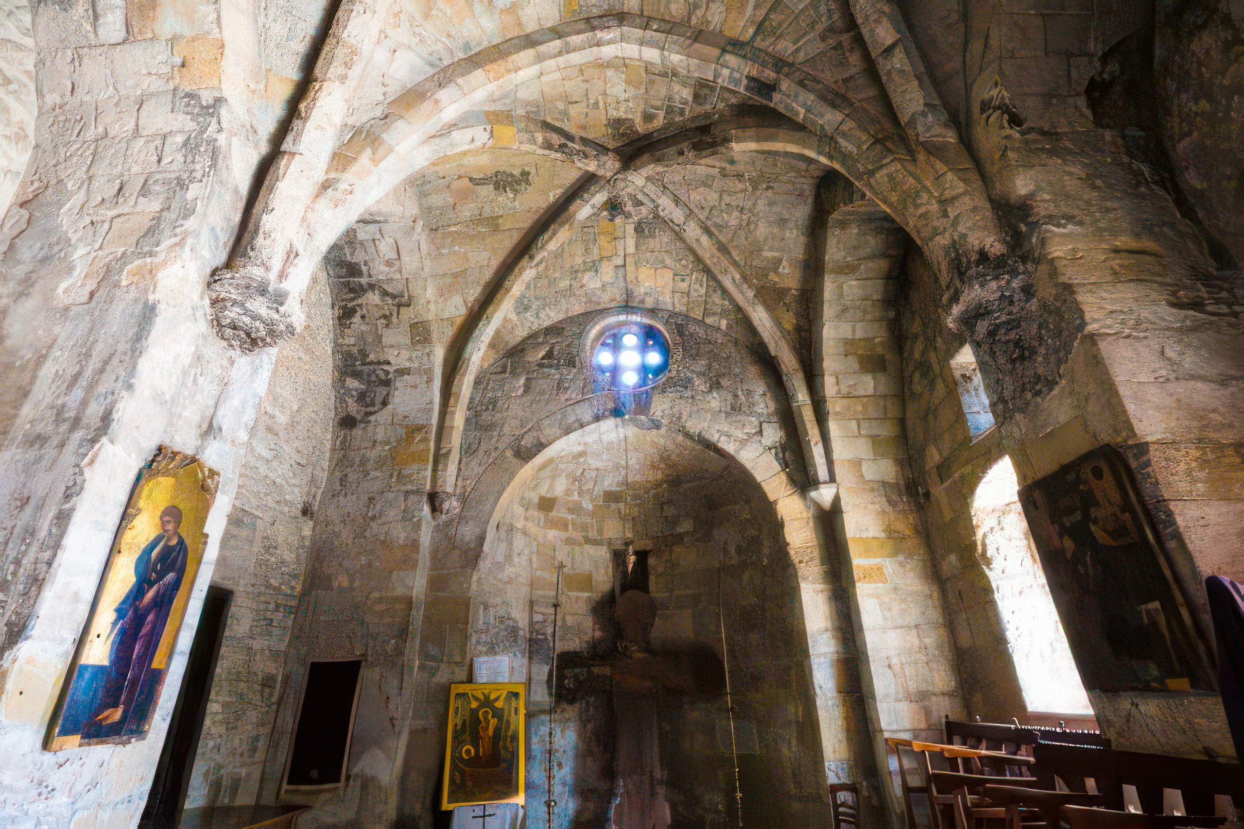 This excavation also revealed that two construction phases preceded the current church, a columned basilica followed by a pier basilica in the 6th or 7th century. The semi-circular synthronon, the seat reserved for clergy placed in the apse, survives from the 5th century basilica and can still be seen behind the altar. The church was constructed from rubble masonry, a common building technique in Byzantine Cyprus.