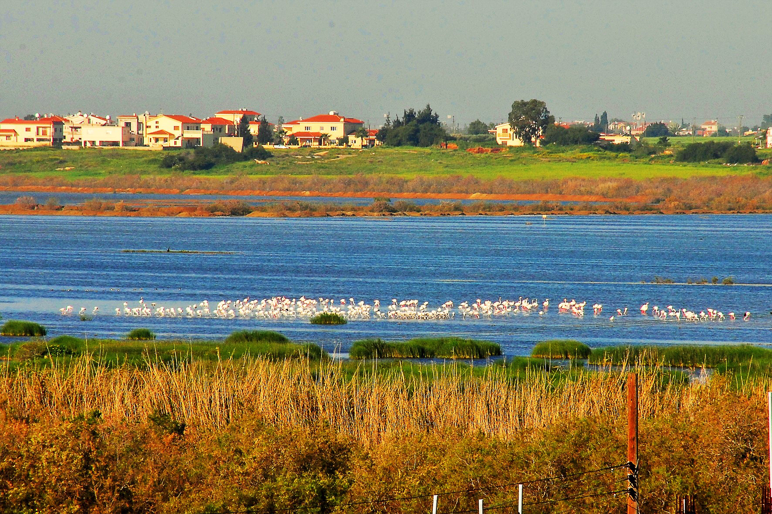 The lake sits just west of Paralimni town in the Famagusta district. Visitors can park behind the Super Action store and Lidl supermarket, the closest access point to flamingo viewing areas. A dusty road runs parallel to the lake from the Super Action side, allowing car access for those unable to walk long distances. Plans exist for a bird hide, though construction depends on local municipality decisions.