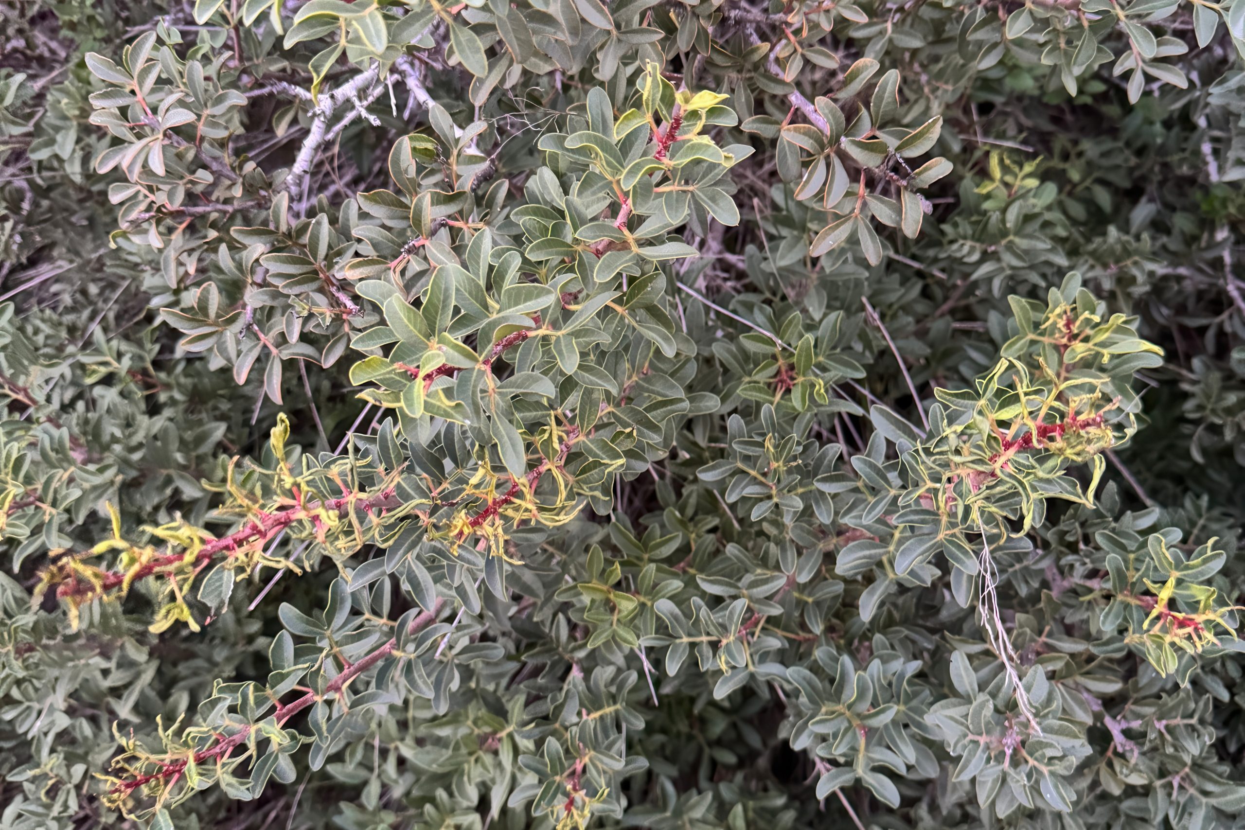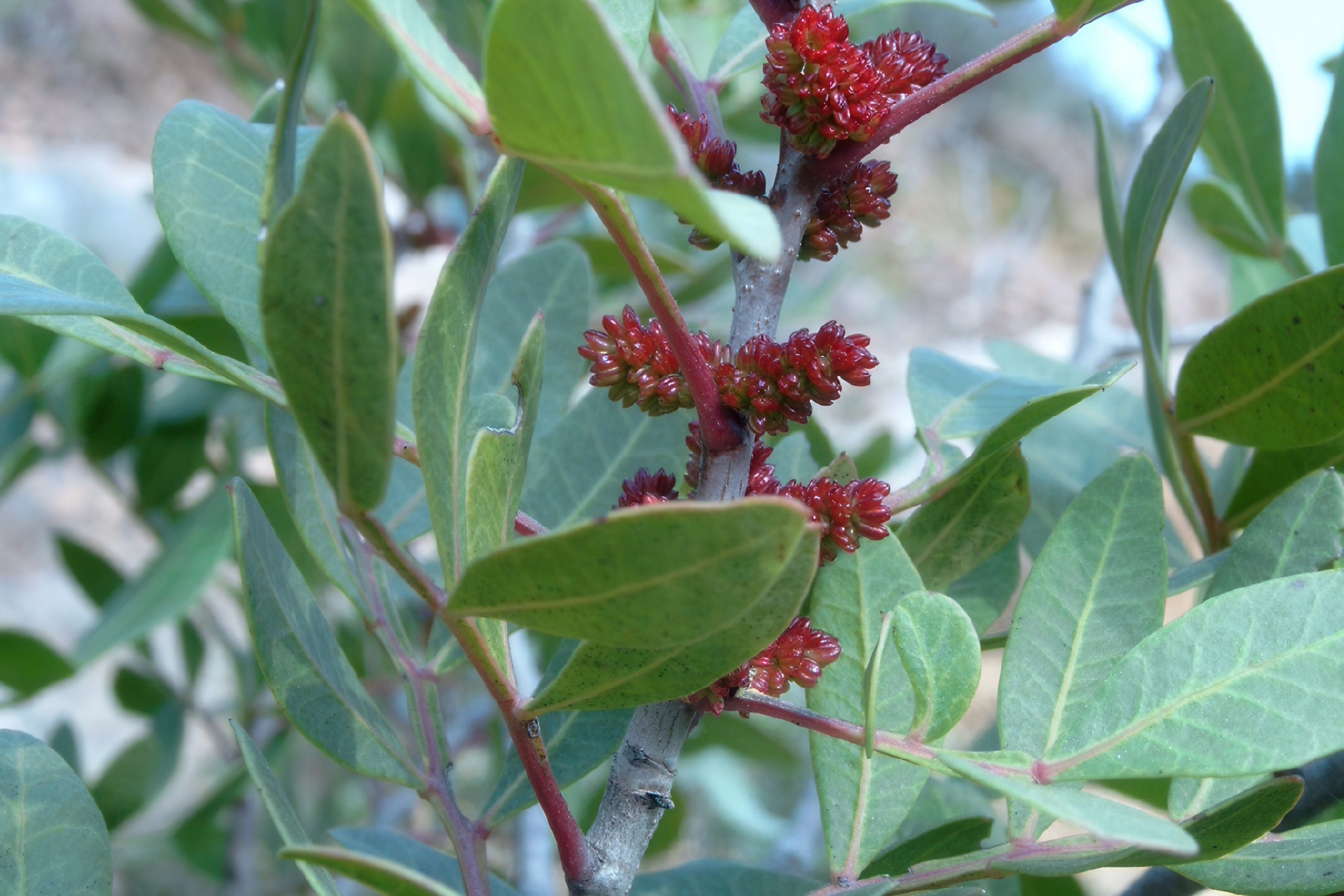 A close cousin, the mastic tree (Pistacia lentiscus or Σχίνος/schinos in Cypriot Greek), is evergreen, smaller (up to 4–8 m), with glossy leathery leaflets and red berries – equally tough and resinous, common in coastal maquis.