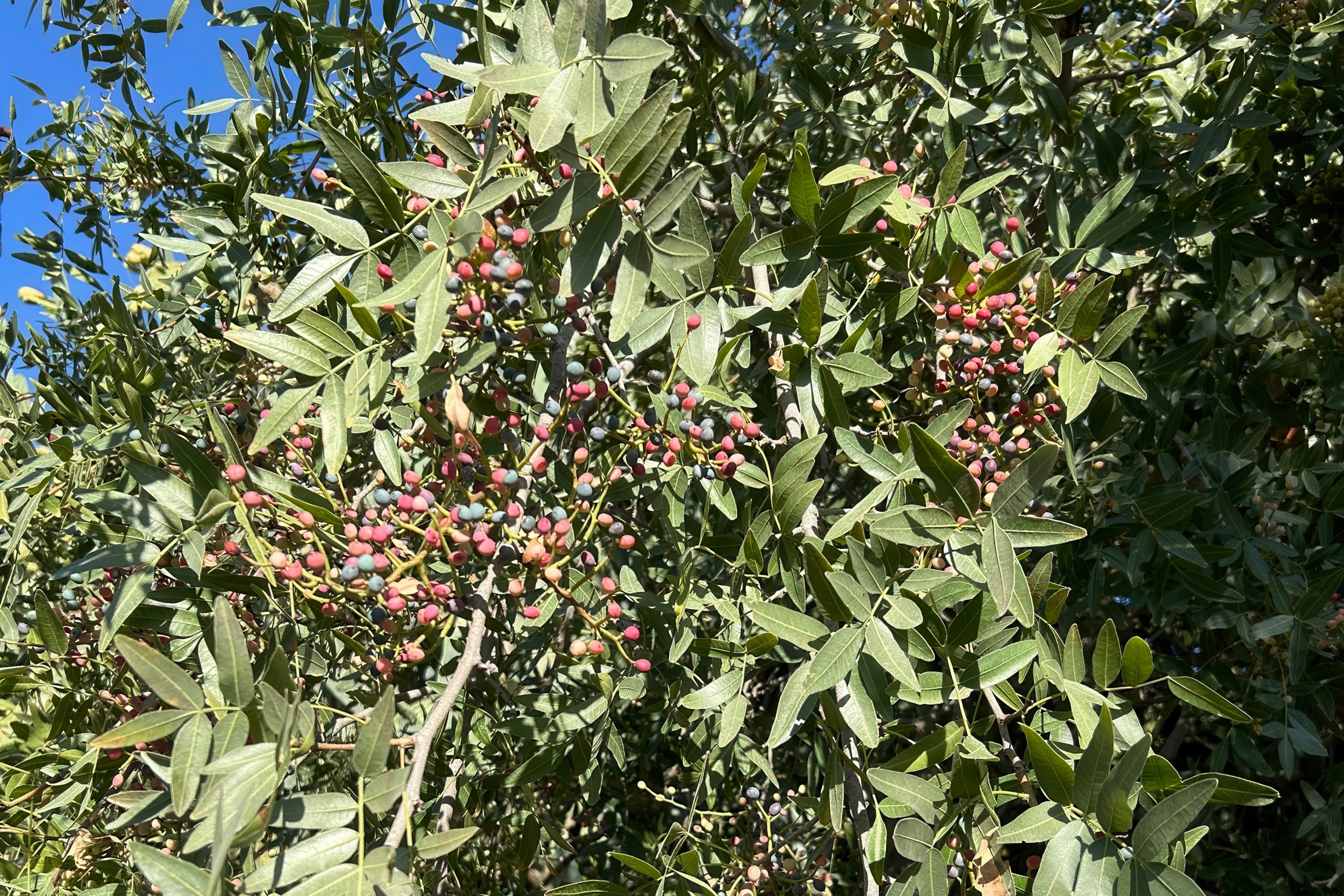 The wild pistachio can reach 15 metres with a broad, rounded crown and deeply furrowed bark that bleeds aromatic resin when scratched. Its bright-green, pinnate leaves turn vivid gold in autumn. Spring brings small, inconspicuous flowers; summer and autumn bring pea-sized fruits that ripen from bright red to dark purple-black, a feast for birds.