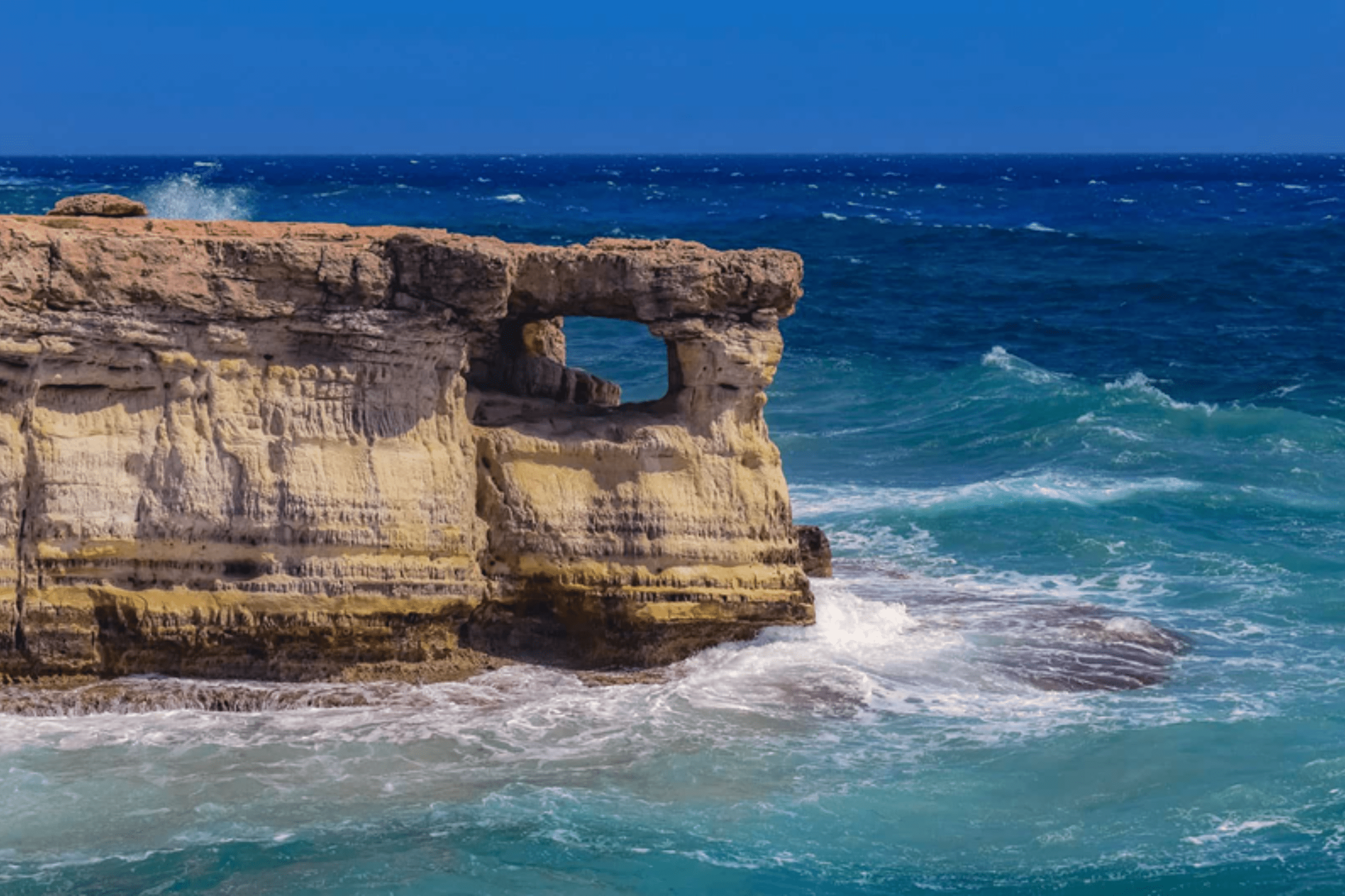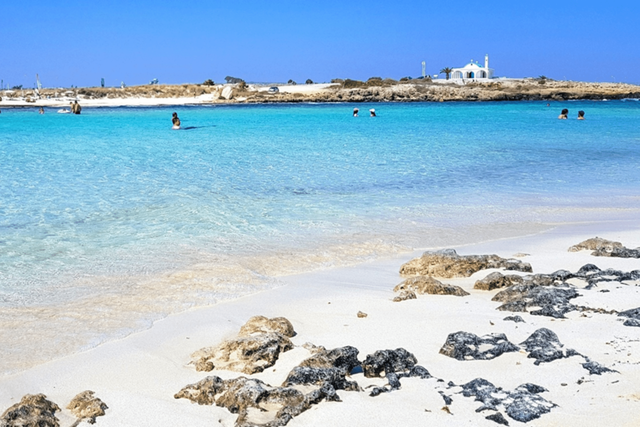 The route continues east to Ayia Napa and Protaras, known for exceptional beaches. Ayia Thekla beach features fine white sand and crystal-clear waters, ranked among Cyprus’s prettiest beaches. Cape Greco National Forest Park provides coastal walking trails, sea caves, and the Love Bridge rock formation. The Musan Underwater Sculpture Park near Ayia Napa contains 93 sculptures at approximately 10 meters depth, accessible to snorkelers and divers.