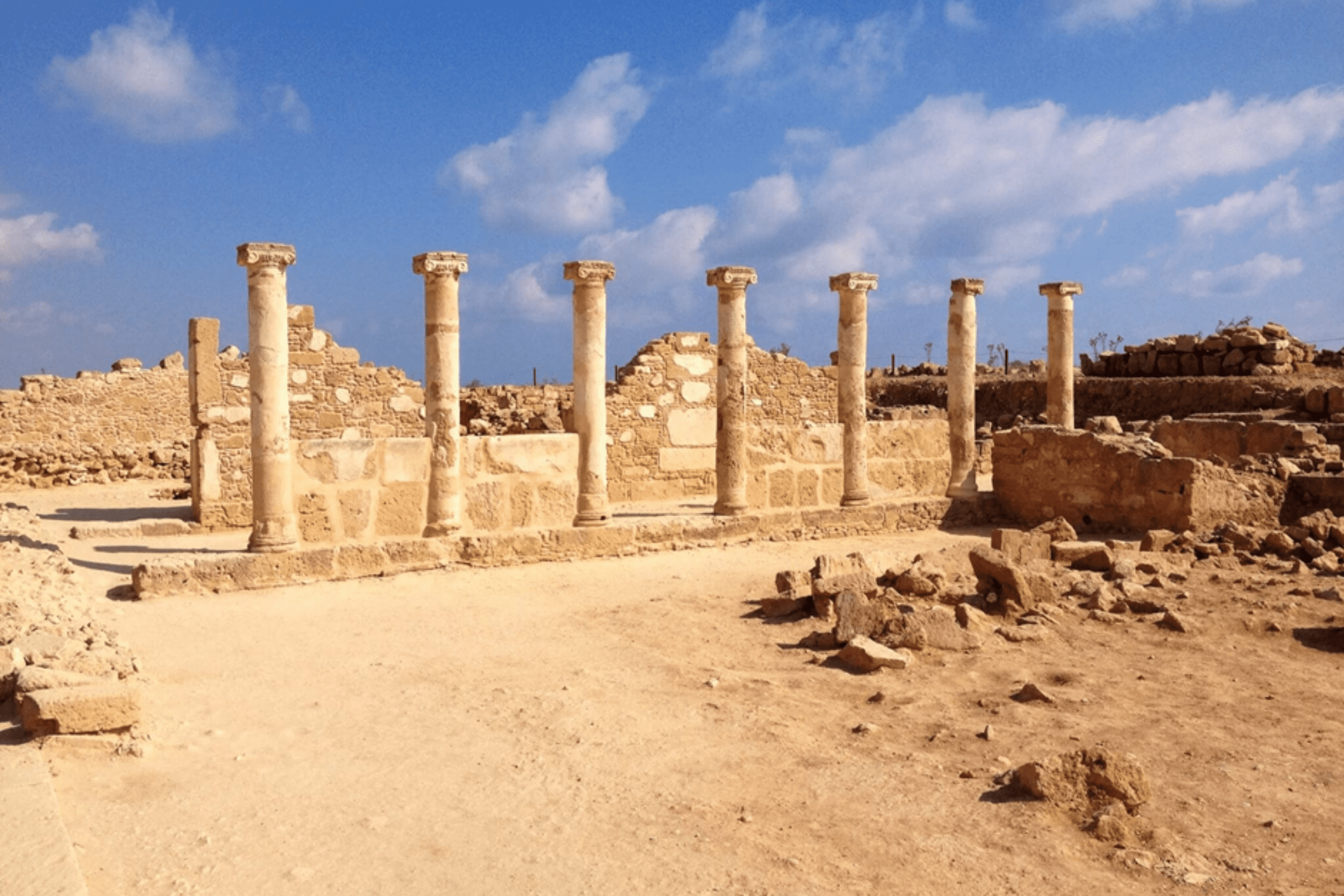 Ancient Kourion sits on a cliff 70 meters above the Mediterranean between Limassol and Paphos. The Greco-Roman amphitheater seats 3,500 spectators and still hosts theatrical performances due to exceptional acoustics. The site includes the House of Eustolios with geometric mosaics, the House of the Gladiators, and an early Christian basilica. The adjacent Sanctuary of Apollo Hylates dates to the 8th century BC, with remains of temples, baths, and sporting facilities.