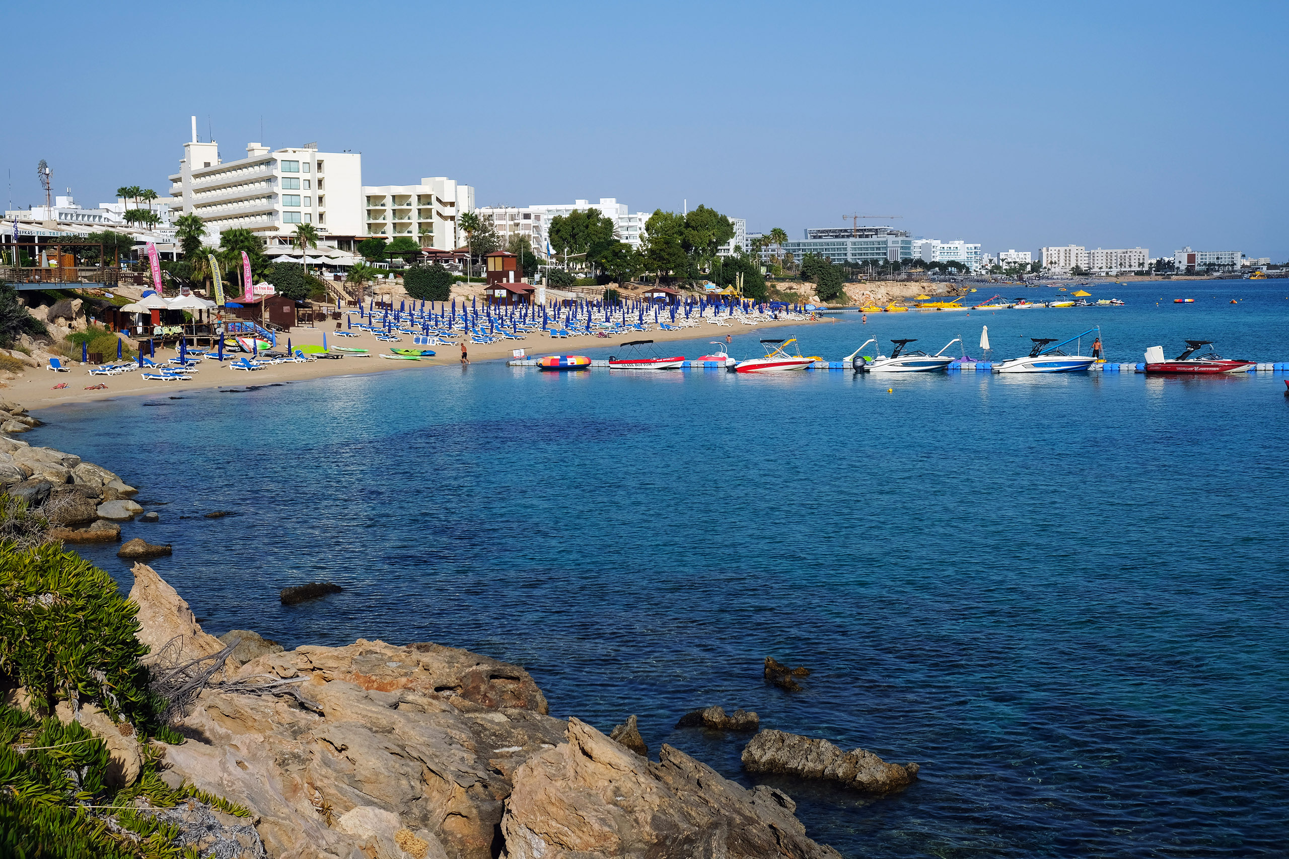 Protaras contains numerous named beaches along its 10-kilometer coastline. Fig Tree Bay remains the most famous, stretching for 500 meters with waters clean enough to earn Blue Flag designation.