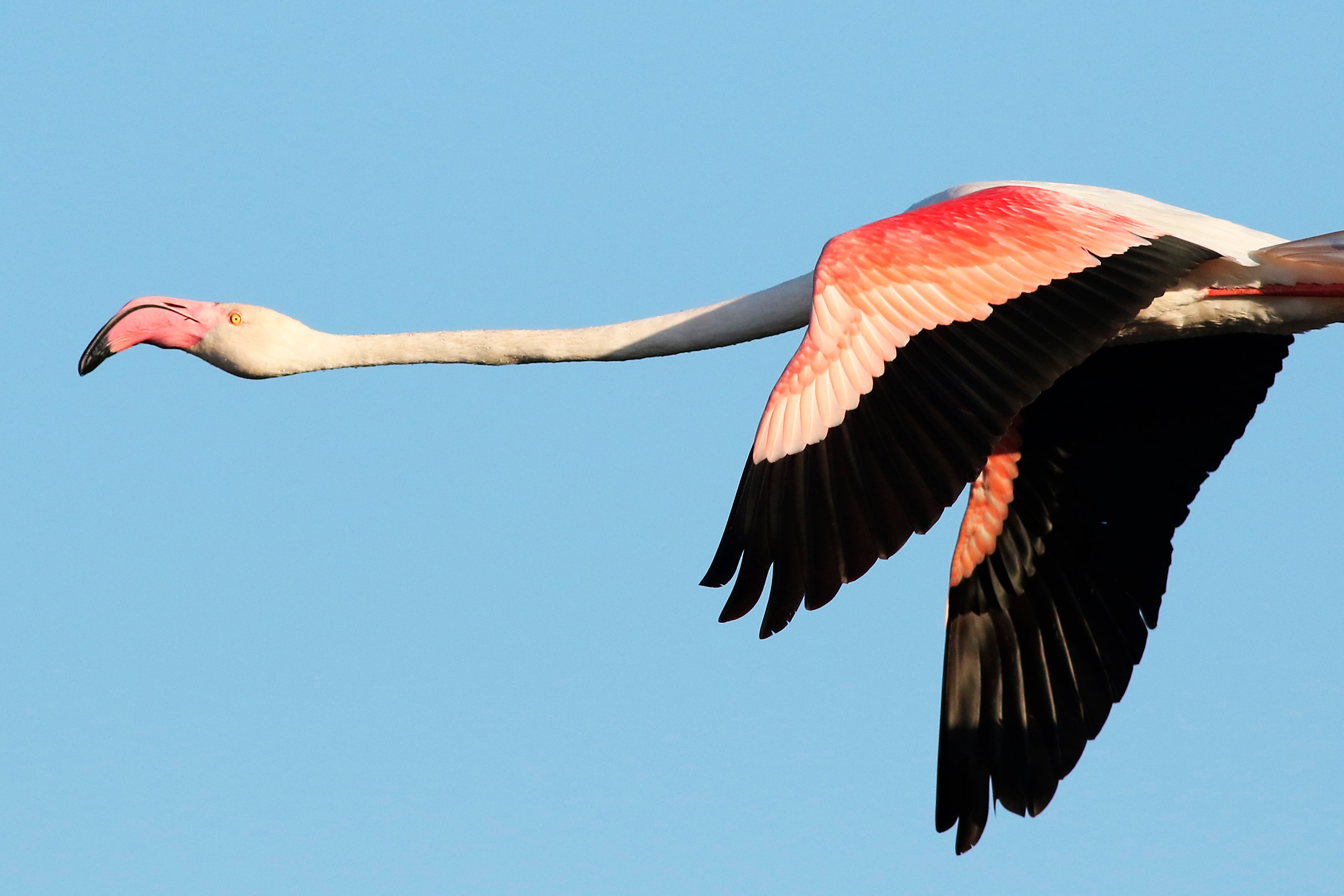These birds stand up to 150 centimeters tall, making them the largest flamingo species in the world. Their distinctive pink coloration comes from carotenoid pigments in their diet of brine shrimp and algae. The intensity of pink varies among individuals based on diet quality and health. Males are slightly larger than females, though both sexes share the same plumage patterns featuring white with pink tones and bright red flight feathers visible when wings spread.