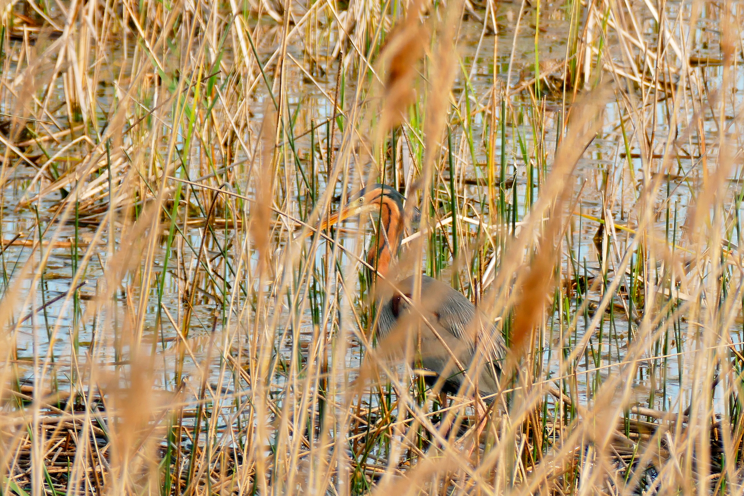 The purple heron also passes through Cyprus during migration. This species features rich purple plumage during breeding season, particularly visible on the head, neck, and thighs. Purple herons prefer dense reed beds and marshy areas with good cover. They demonstrate more solitary behavior than grey herons and show exceptional skill at moving through dense vegetation.