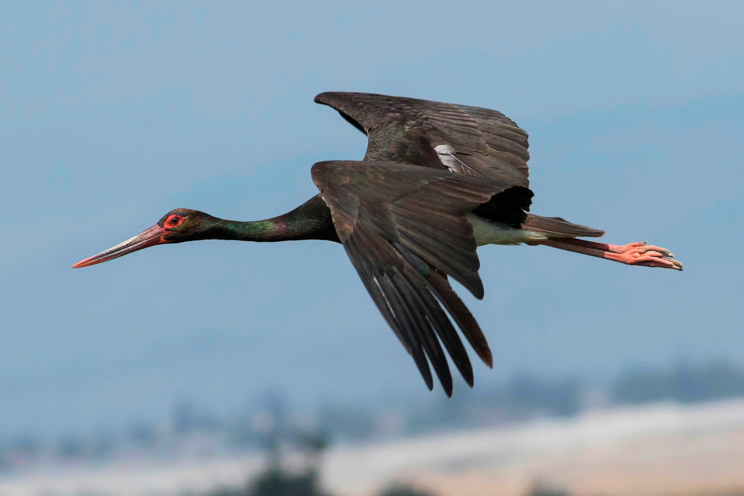 The black stork ranks among the most elusive large birds passing through Cyprus. This species measures 95 to 100 centimeters from beak to tail with a wingspan of 145 to 155 centimeters. Adults display glossy black plumage on the head, neck, back, and wings with iridescent green and purple sheens in sunlight. The underparts are white, creating stark contrast. Long red legs and a pointed red bill complete the distinctive appearance.