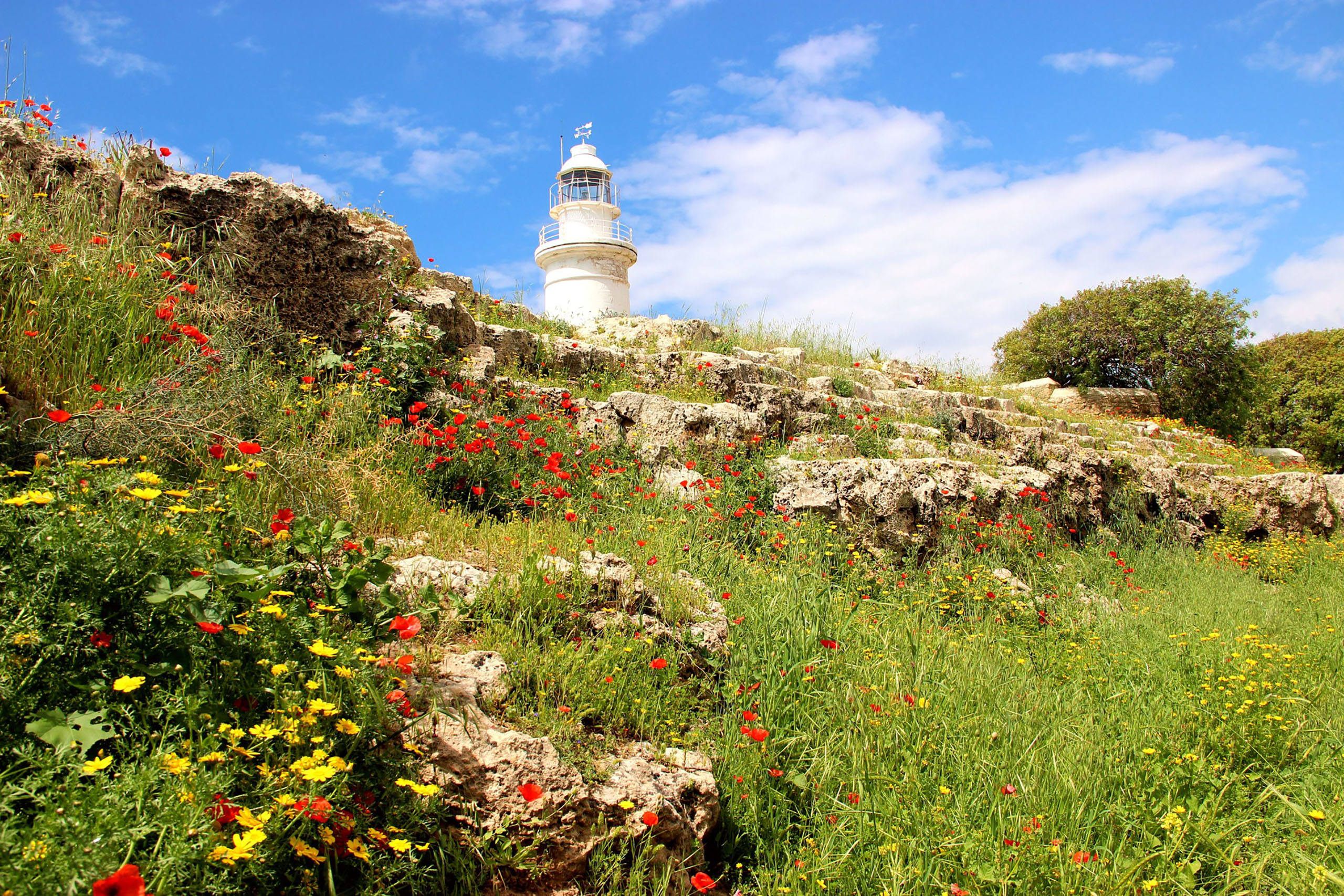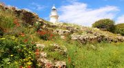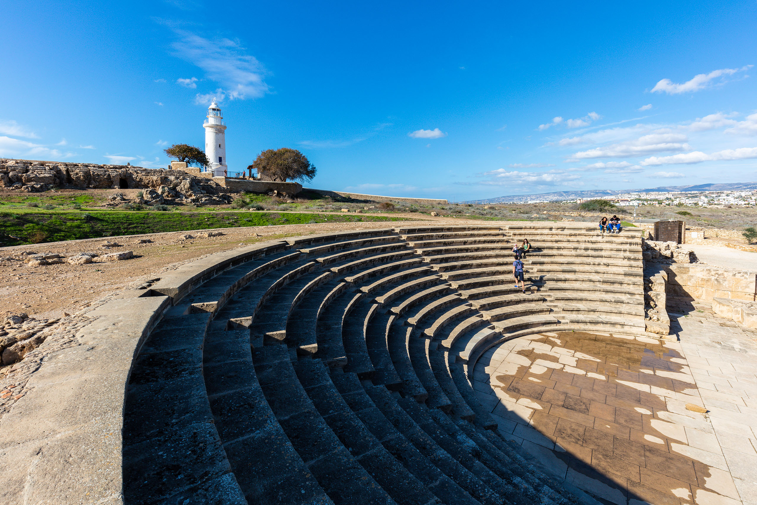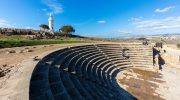 To the north of the theater, sections of the ancient city walls remain visible. These defensive structures protected Paphos during its centuries as the island’s capital. Near the Odeon stands a rocky mound believed to be the acropolis of the ancient town. The Paphos Lighthouse, a much more recent structure built in 1888, rises behind the amphitheater and has become part of the iconic view from the seating area.