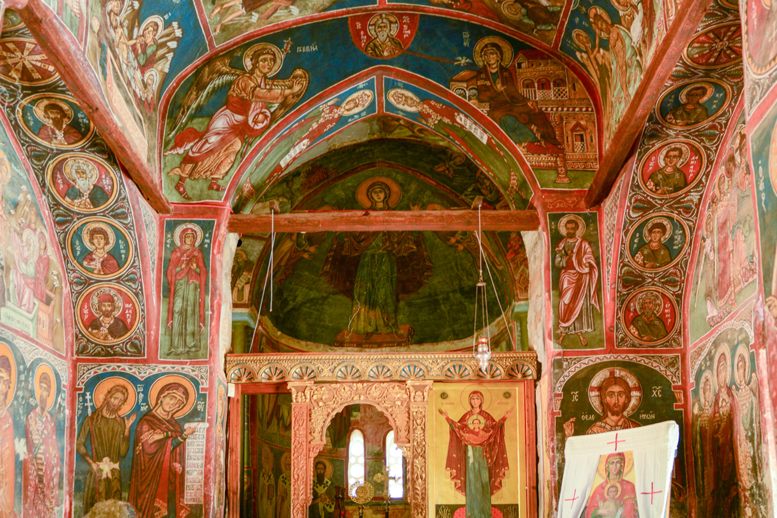 Mountain churches feature steep wooden roofs covered in flat tiles, designed for heavy winter rains in the Troodos Mountains. Inside, many are fully covered in Byzantine frescoes painted with durable pigments that still retain strong color.