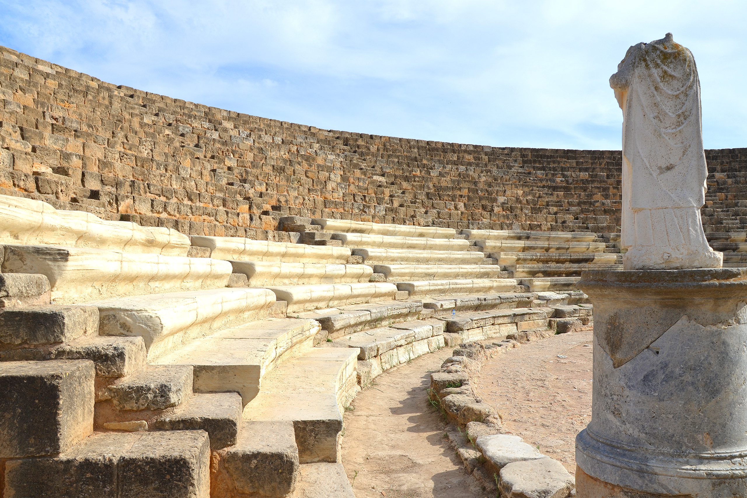 In 58 BC, Salamis became part of the Roman Empire and prospered under Roman rule. Emperors Trajan and Hadrian invested heavily in public buildings. The northern section developed into a cultural center featuring a gymnasium, theater, amphitheater, stadium, and elaborate public baths. The gymnasium, originally constructed during the Hellenistic period, was destroyed by an earthquake in 76 AD and rebuilt with a colonnaded palaestra. The theater, built during Augustus’s reign, could seat 15,000 spectators.