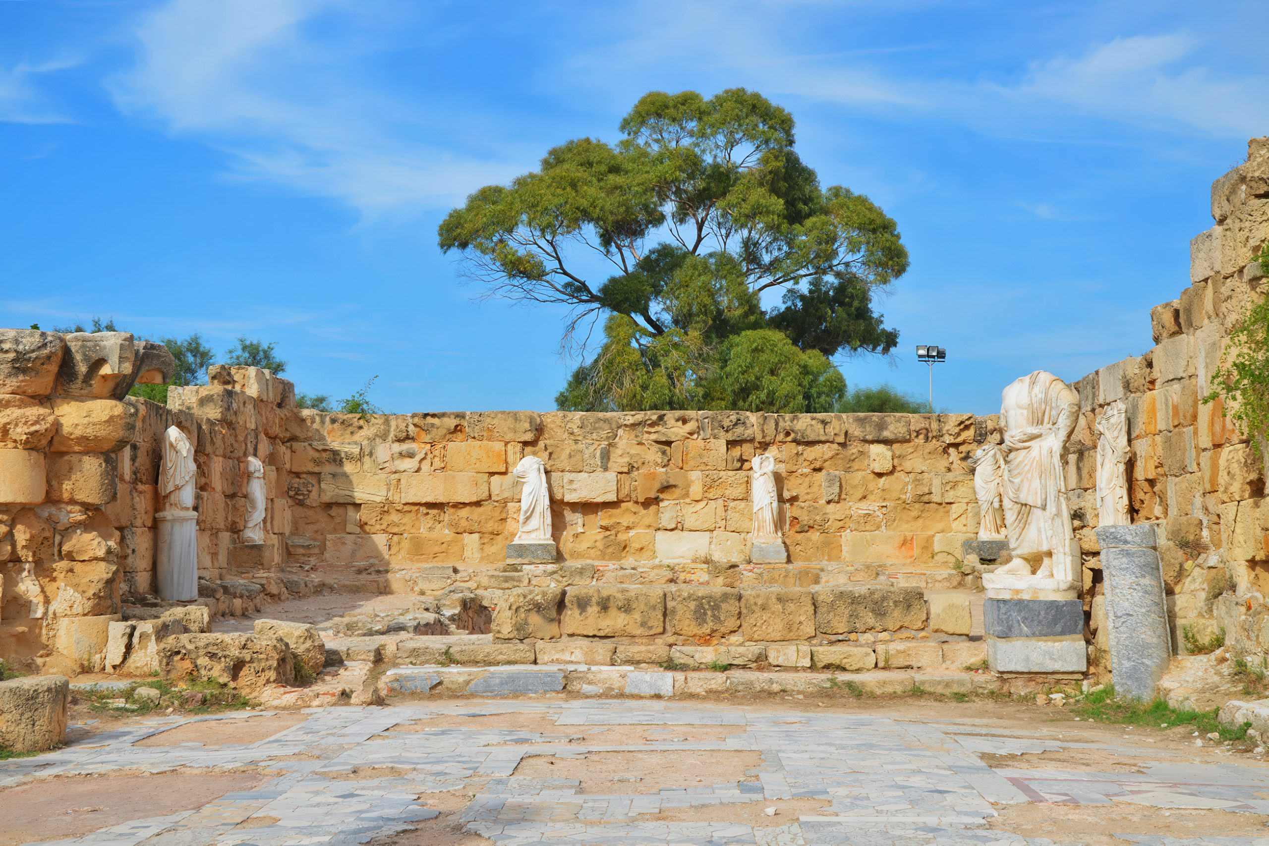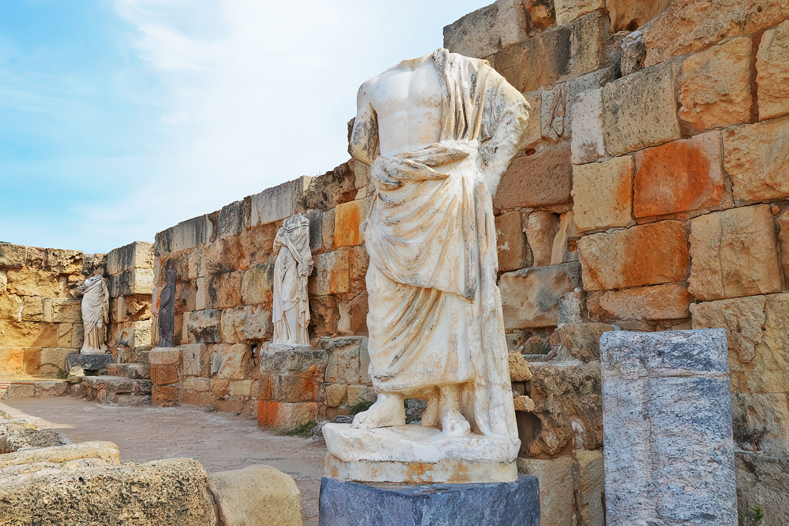 During excavations, several marble statues were discovered that once adorned the spacious colonnades. Many statues that survived numerous raids have disappeared since 1974. Fortunately, several pieces made it to the Cyprus Museum in Nicosia, where they remain prized exhibits. The statues date from the Hadrianic period and are of remarkably high quality. Among the most notable are over-life-size statues of Hera and Apollo Citharoedus, the lyre player, which remarkably retained their heads. Other significant pieces include statues of Hygeia, Asklepios, Aphrodite, and Nemesis with a griffin at her feet.