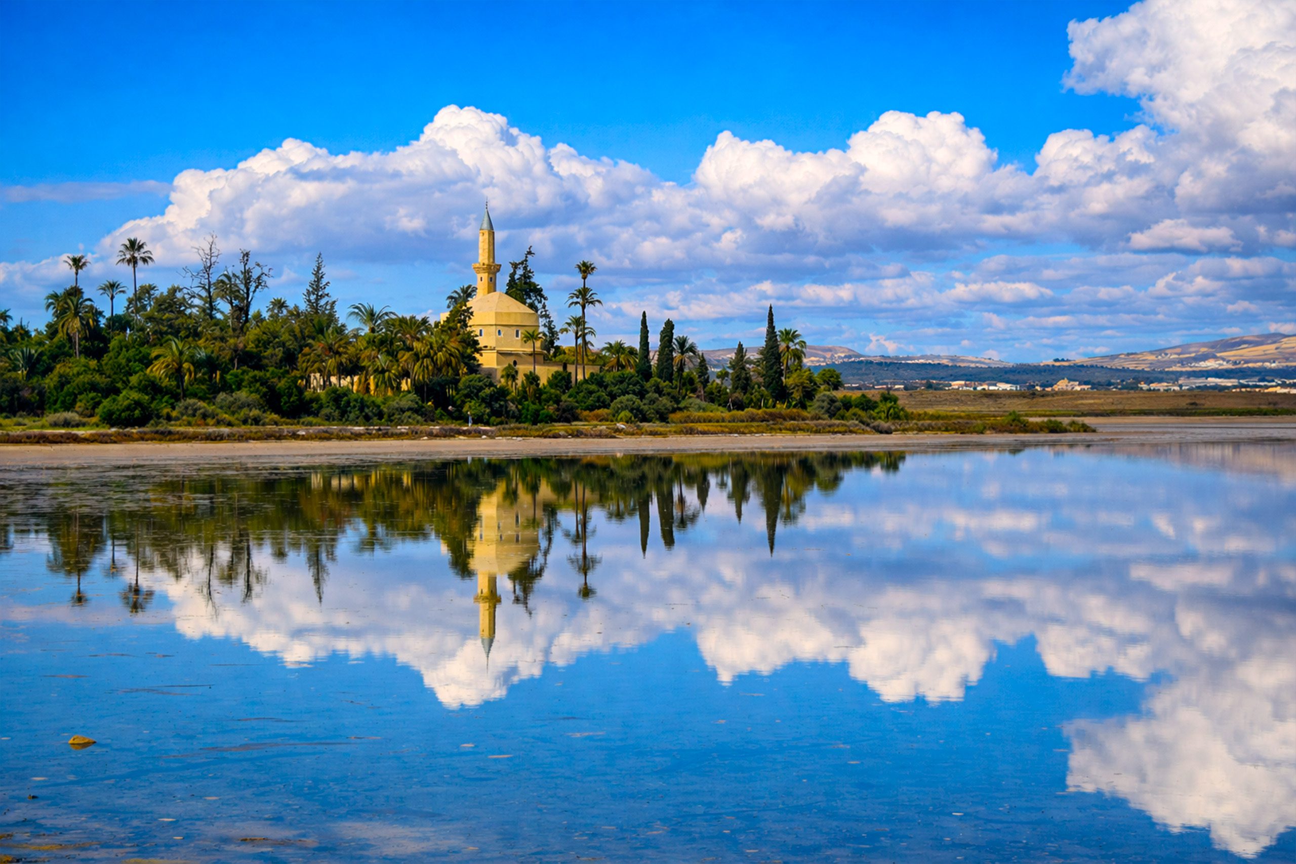 The lakes measure 2.2 square kilometers total and sit just off the road to Larnaca International Airport, making them one of the area’s most recognizable landmarks. Water depth reaches a maximum of one meter during winter. The lakes fill with water during the rainy season from November through March, then dry completely by summer, leaving exposed salt flats.