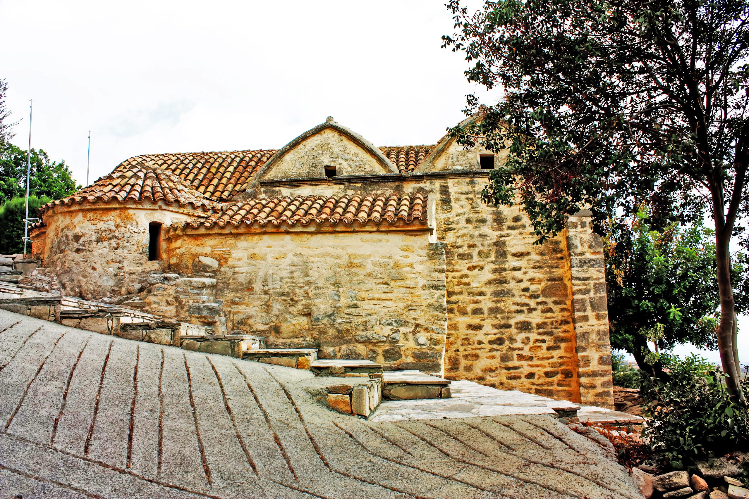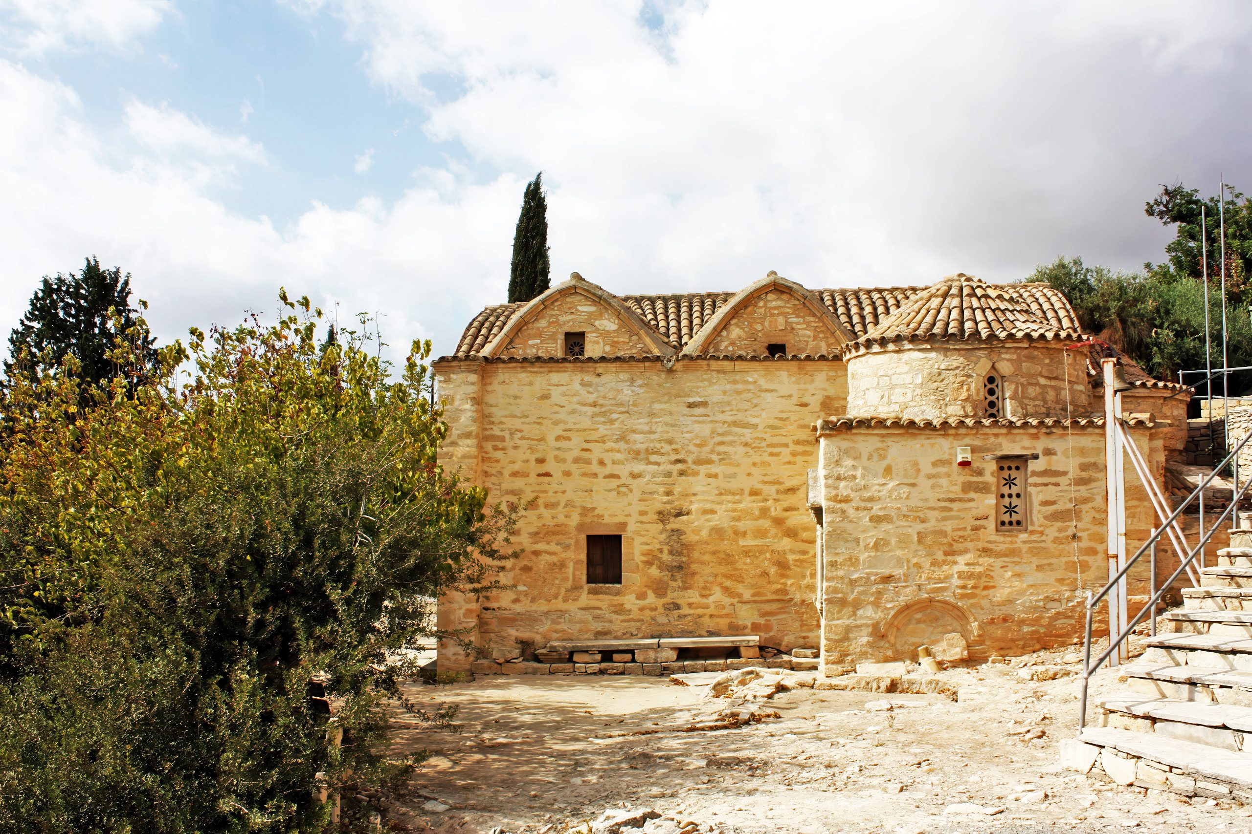 The Church of Panagia Diakinousa is a three-aisled basilica, one of the largest of its kind in Cyprus, dating to the 18th century but incorporating 14th-century chapels. Its architecture features stone walls, arched roofs, and integrated northeast and northwest chapels for private prayers. The interior houses a silver-covered icon of the Virgin Mary, believed miraculous, drawing devotees for blessings. Worship involves lighting candles, offering tamata (votive plaques), and participating in festivals like the Assumption on August 15, where processions mimic ancient fertility dances.