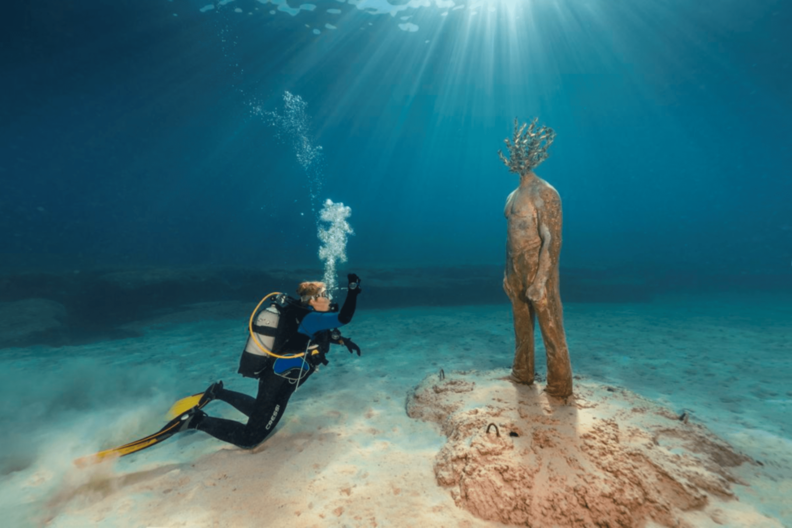 The Museum of Underwater Sculpture Ayia Napa, or MUSAN, opened in August 2021 as Cyprus’s first underwater forest and sculpture park. Located off Pernera Beach between Protaras and Ayia Napa at depths of 8 to 10 meters, the installation features 93 sculptural elements created by British artist Jason deCaires Taylor, covering approximately 1,000 square meters of previously barren seabed.