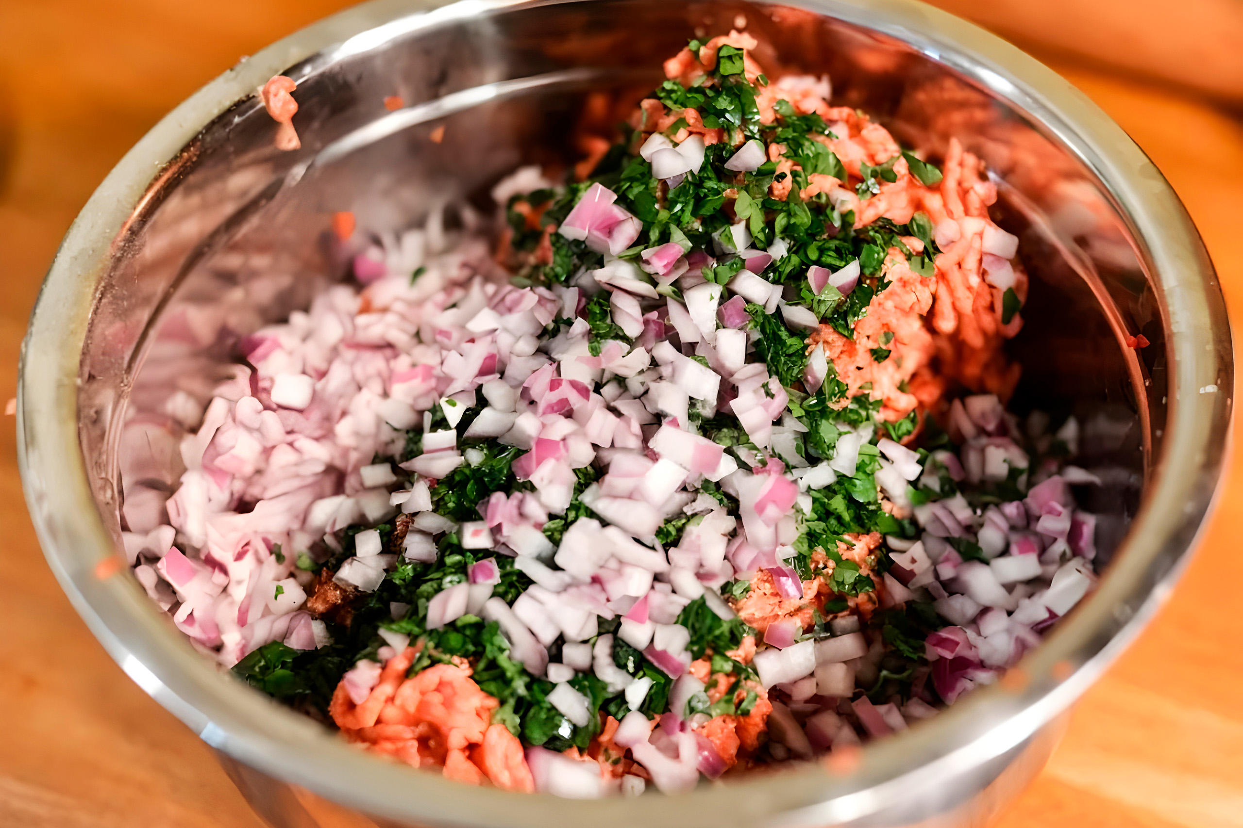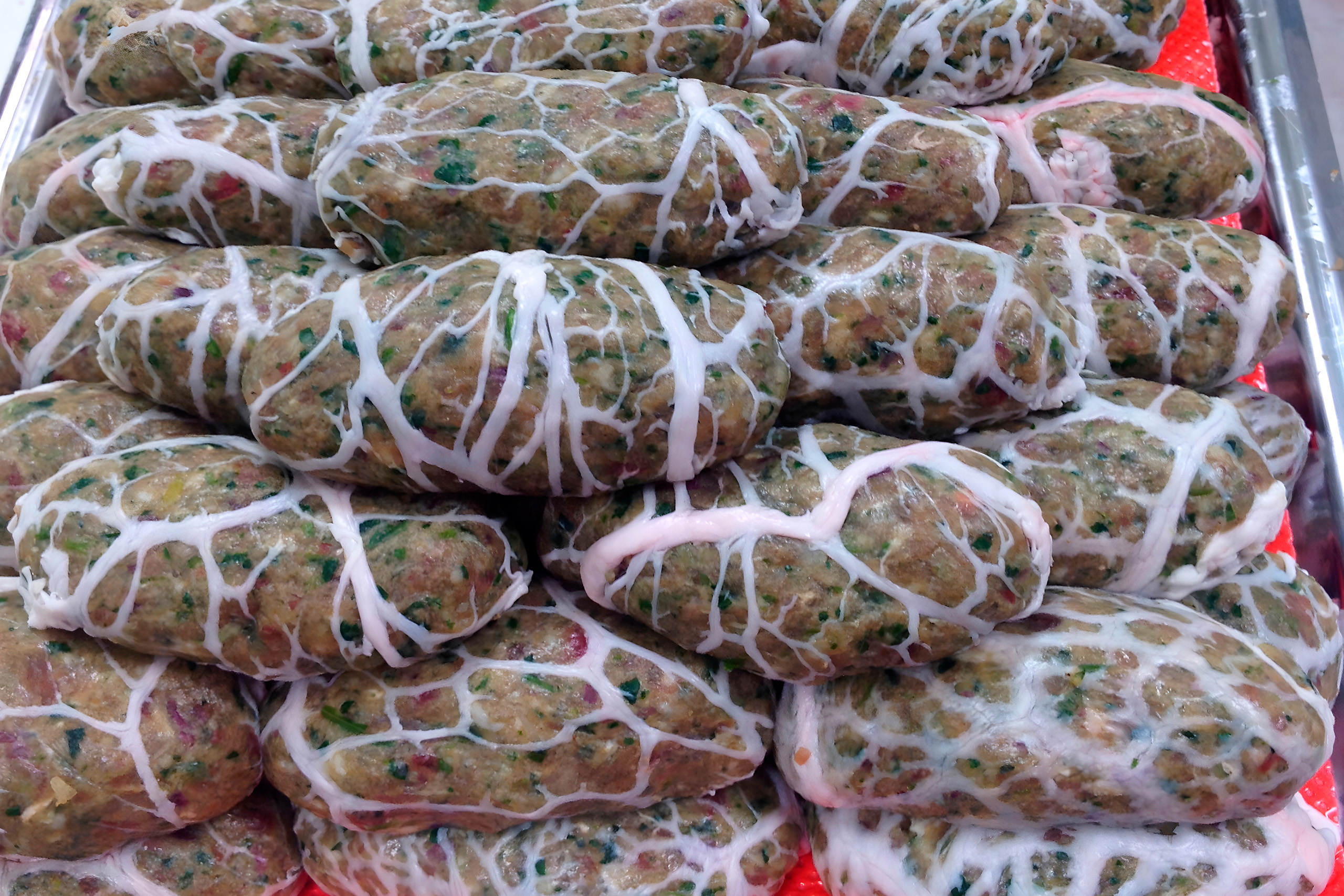 The ingredients remain simple: meat, onions, parsley, salt, and pepper. Some regional variations add cinnamon or cumin. The mixture is formed into ping-pong or golf-ball sized portions, shaped into ovals, then carefully wrapped in a single layer of caul fat.