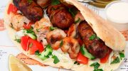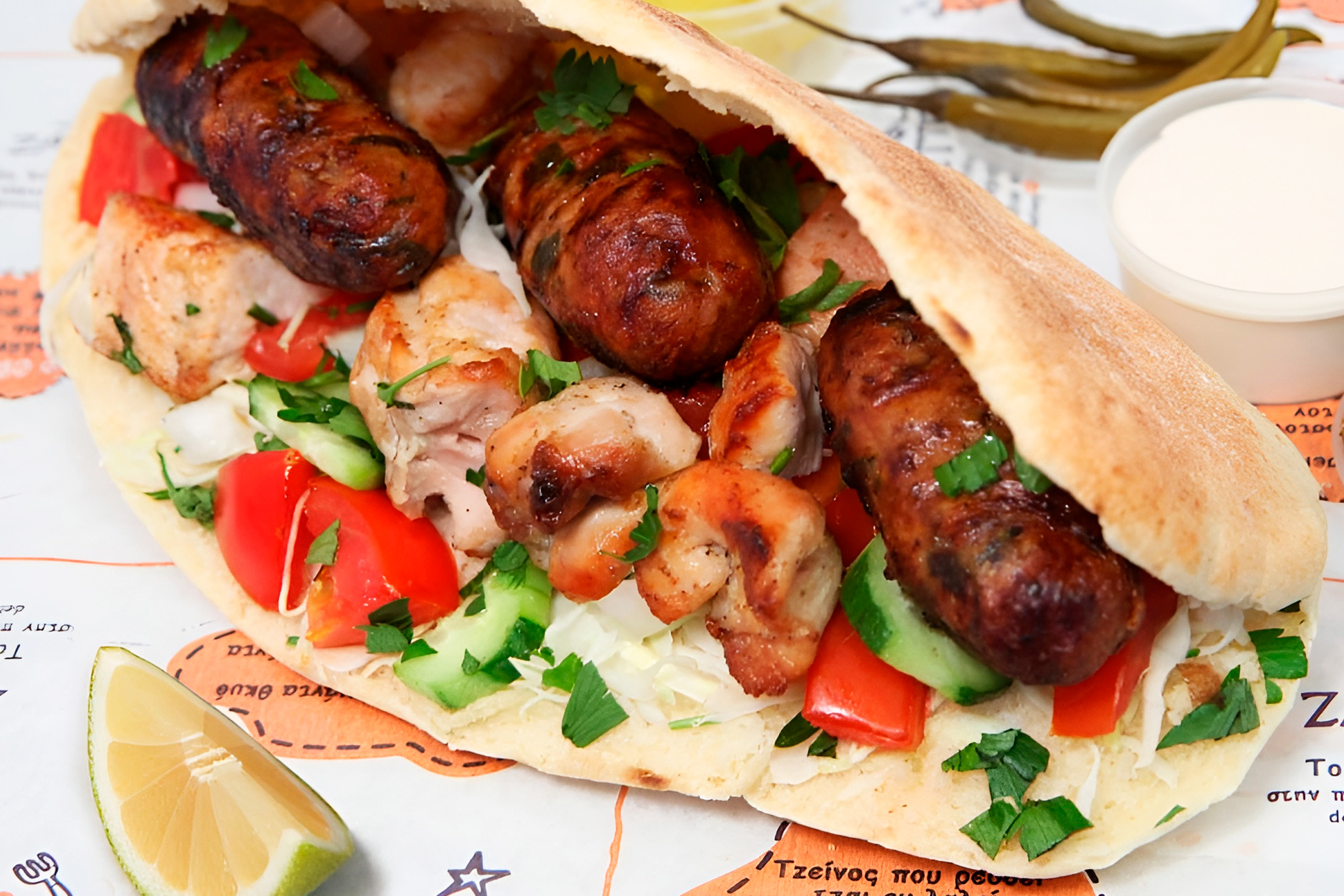 Small kebab shops throughout Cyprus neighborhoods sell sheftalia and souvlaki together, often as “mixed” portions. The standard serving method involves warm Cypriot pita bread with a pocket opening, filled with sheftalia and a simple salad of tomatoes, cucumbers, onions, and parsley.