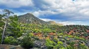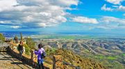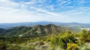 The views from the monastery area extend across the Mesaoria plain to Famagusta in the east, the Troodos Mountains to the northwest, and the Mediterranean Sea to the south. A trail follows the forest road around the periphery of Stavrovouni Hill, running through reforested areas and low scrubby vegetation, covering 7.8 miles.