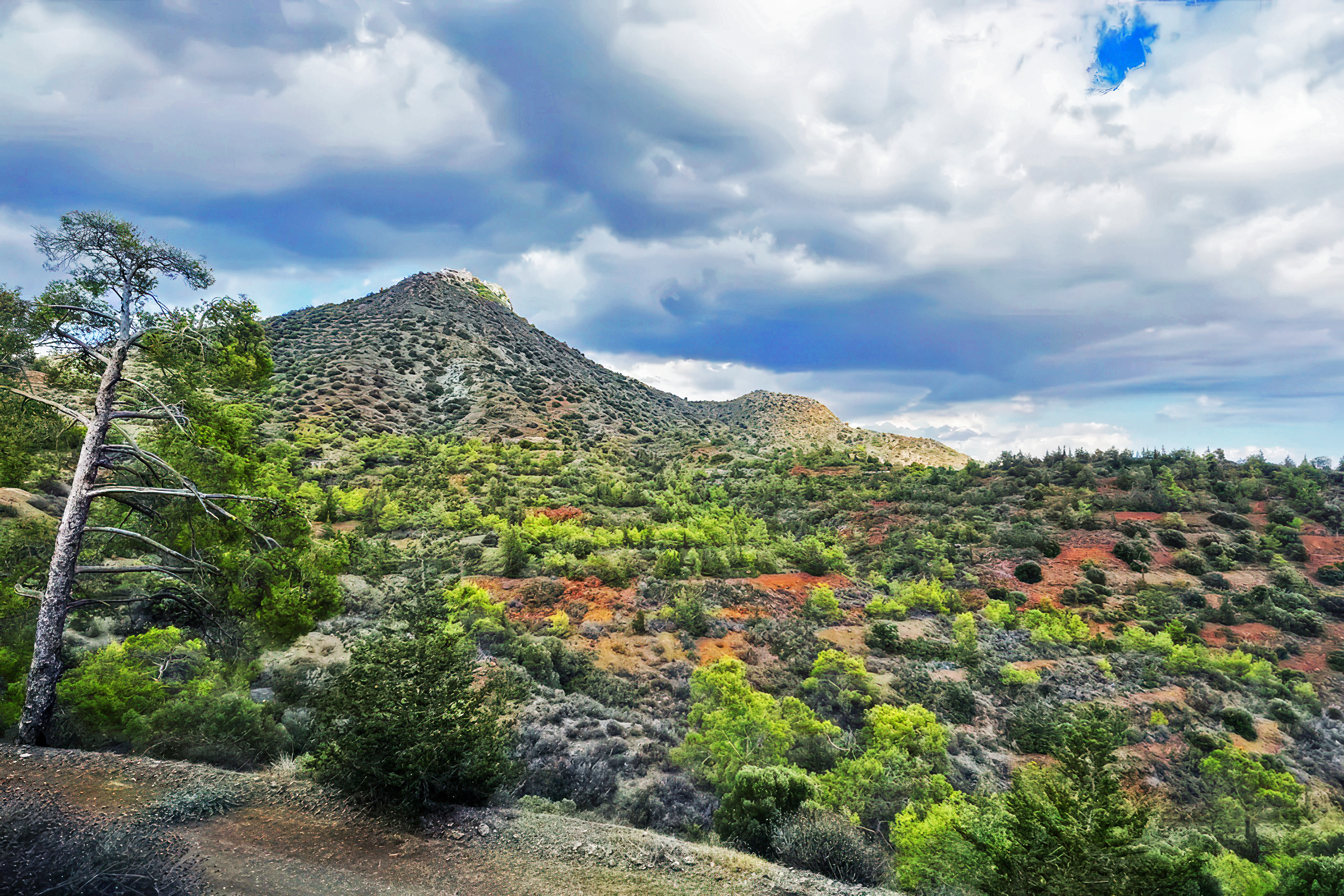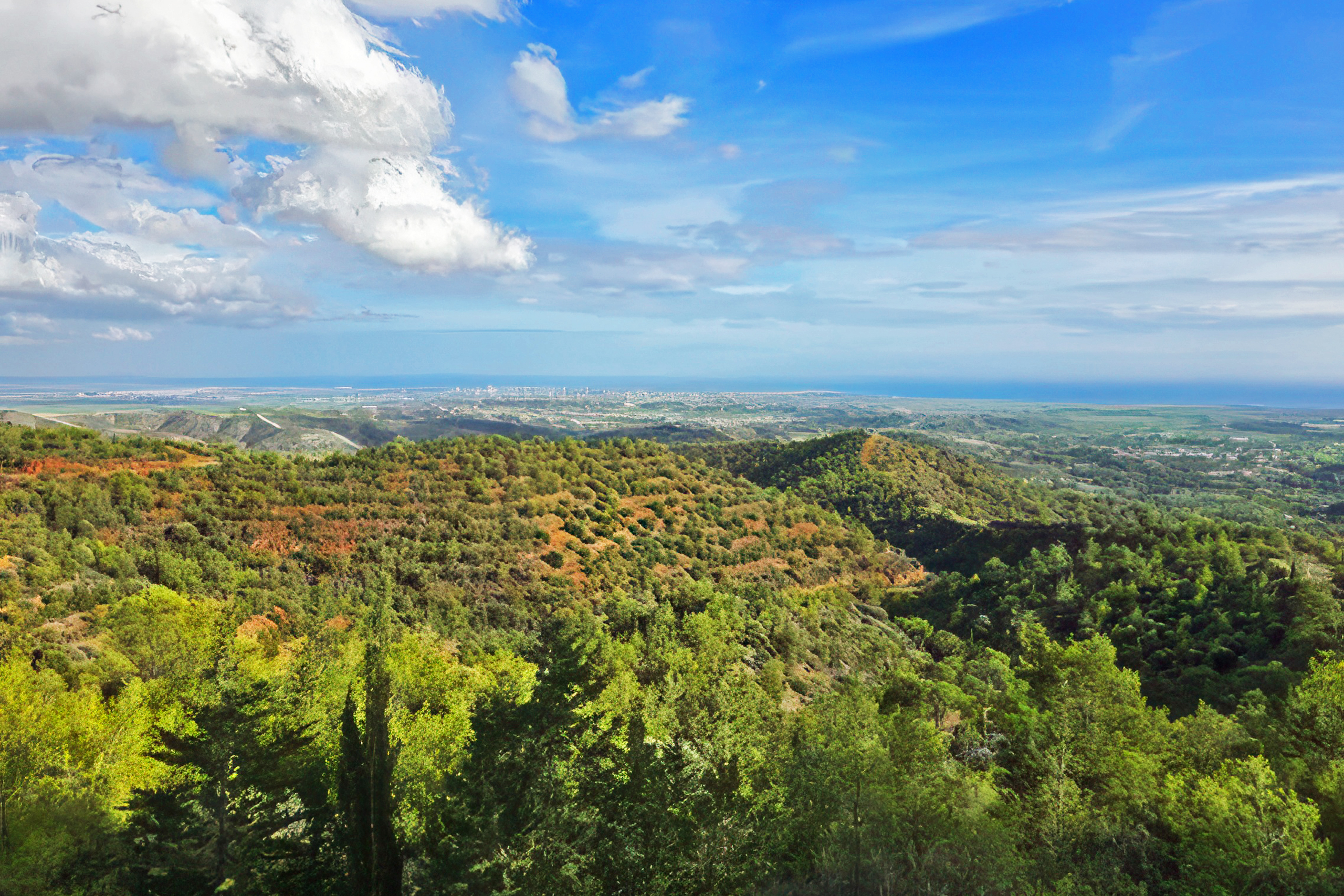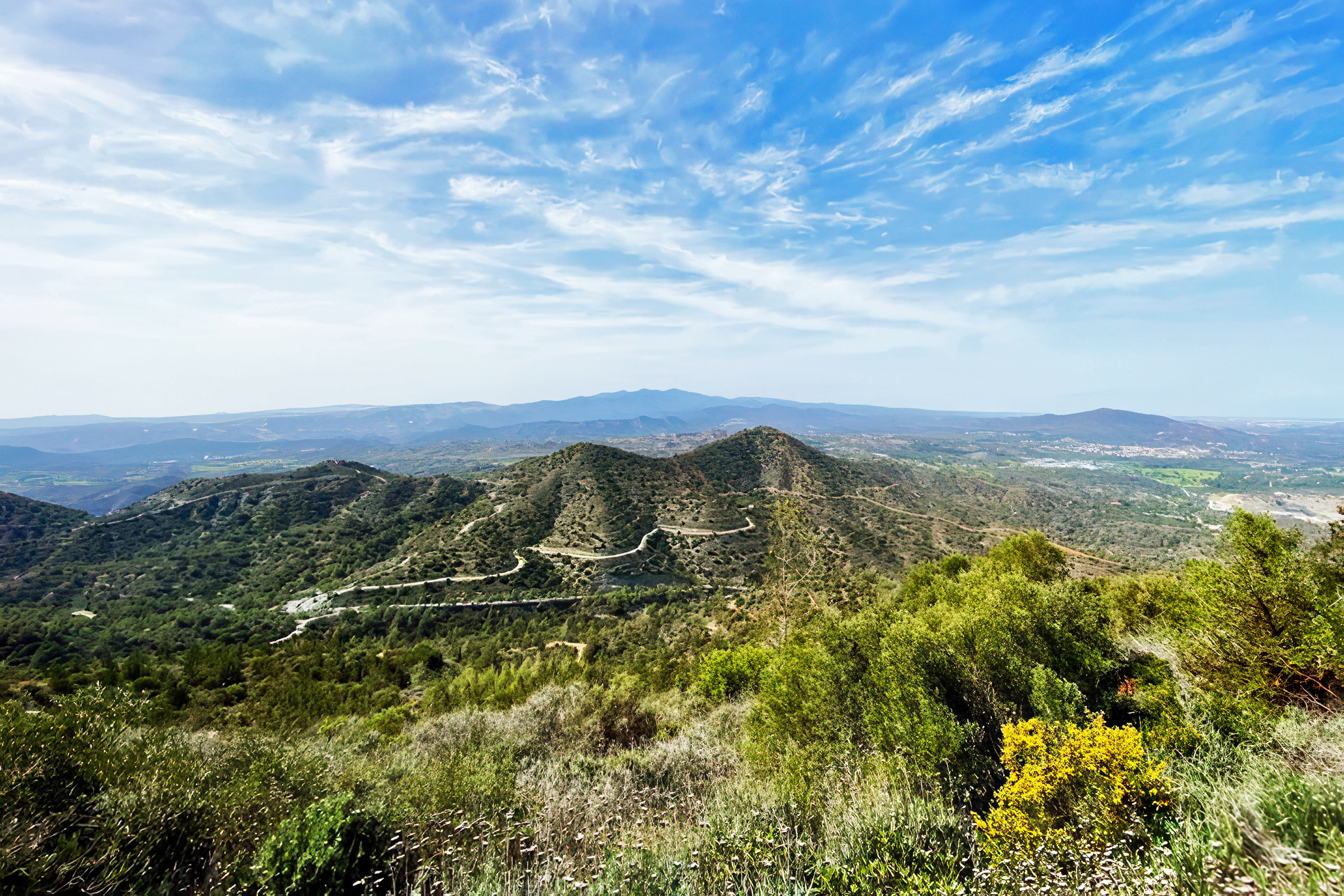 The Stavrovouni-Lefkara Hills region forms a distinctive landscape in southeastern Cyprus where forested mountain slopes meet traditional agricultural communities. The Stavrovouni Forest has an extent of approximately 19 square kilometres, with its highest peak reaching 688 metres at the center, where the historic monastery stands.