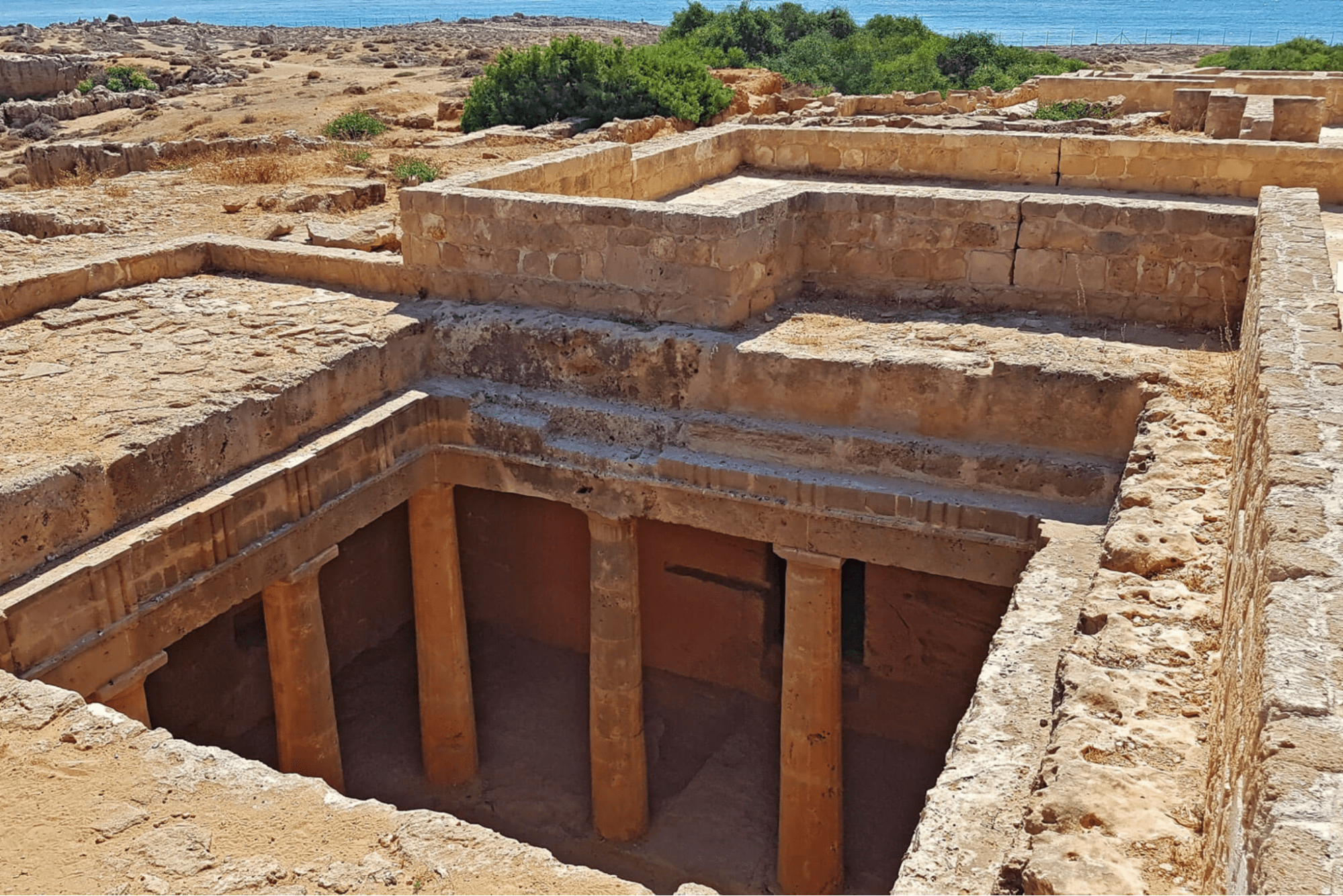 The Kato Paphos Archaeological Park preserves multiple coastal monuments including four Roman villas with exceptional mosaic floors, an Odeon theatre carved from limestone, ruins of the Saranta Kolones Fortress, and remains of early Christian basilicas. The site’s coastal location made it the capital of Roman Cyprus from 58 BC onward, concentrating administrative, religious, and cultural functions in structures that exploited the dramatic meeting of land and sea.