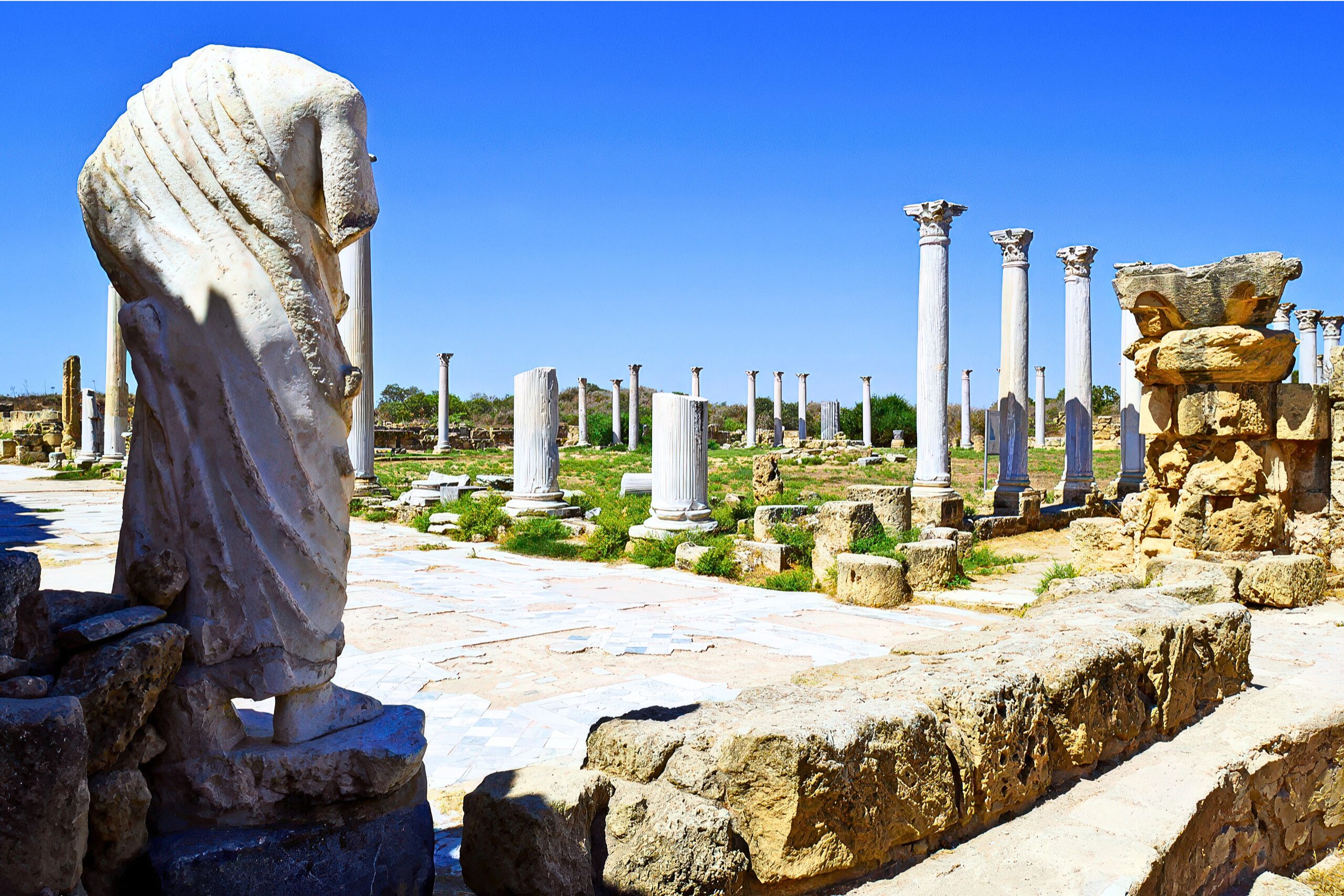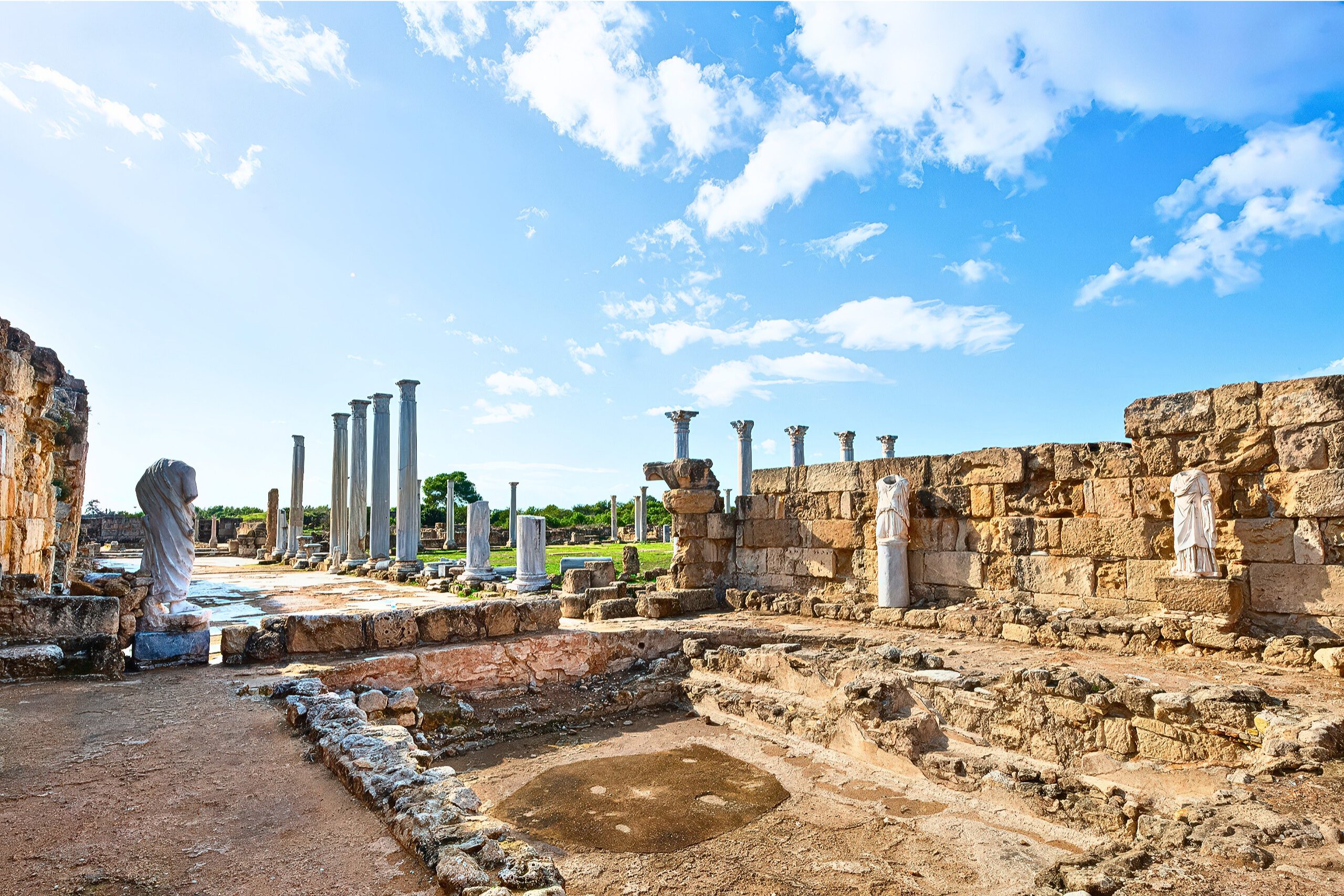 The archaeological site of Salamis lies about six kilometers north of modern Famagusta. Visitors can walk among extensive ruins including the gymnasium, theatre, baths, and parts of the ancient agora. The scale of remaining structures conveys the city’s former grandeur.