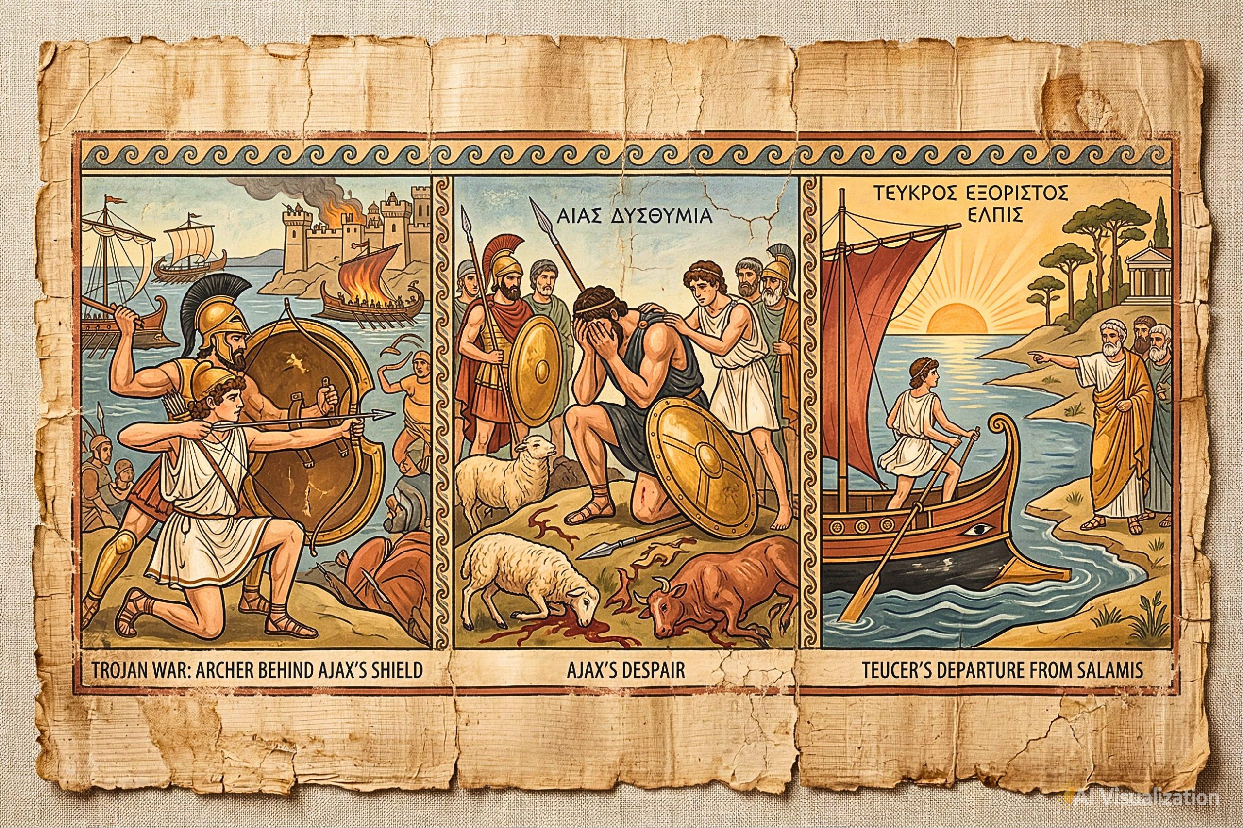 The trial before King Telamon resulted in harsh judgment. Despite Teucer’s explanations that he had secured Ajax’s burial against opposition from other Greek leaders, Telamon found his son guilty of negligence. The king disowned Teucer and banished him from Salamis. The exiled hero gathered loyal followers and set sail, speaking words preserved by the Roman poet Horace: “nil desperandum” meaning “do not despair” and announcing they would “tomorrow set out upon the vast ocean.”