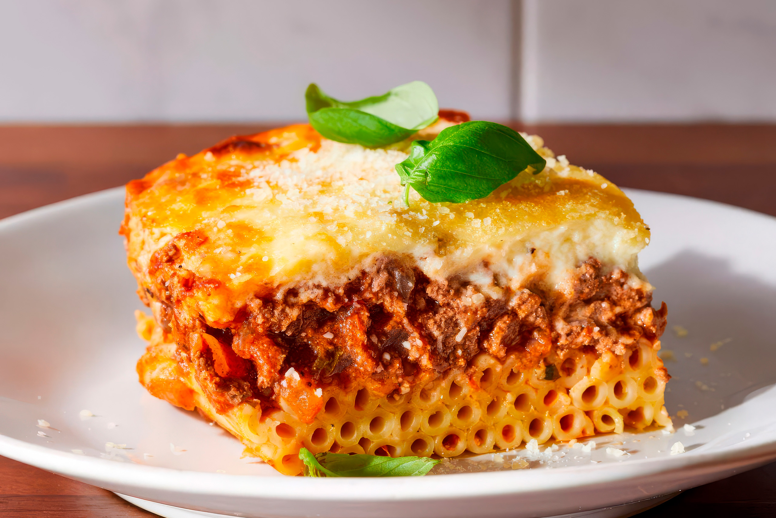 The dish is built in layers. Tubular pasta forms a firm base, a lightly spiced meat sauce sits at its centre, and a thick béchamel enriched with eggs and local cheese seals the top. This structure is deliberate. When sliced, the layers hold their shape, allowing large trays to be portioned cleanly for many people. Long before it became emblematic, this practicality made it ideal for communal meals.