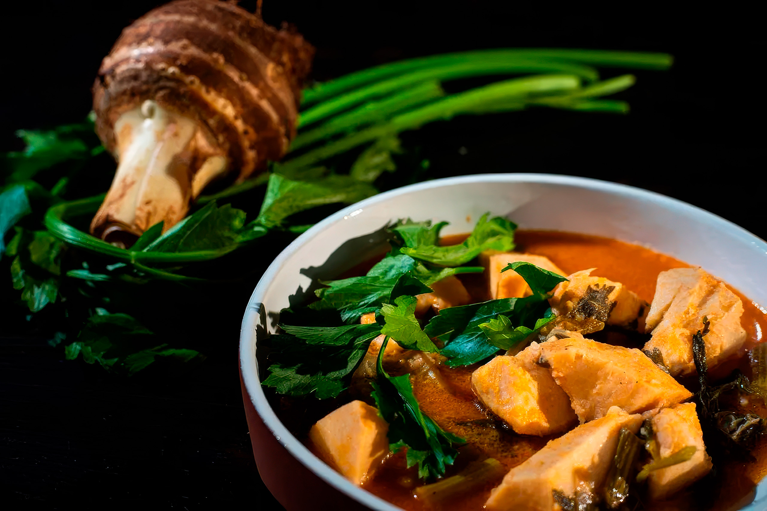 Kolokasi is almost always cooked with meat, most often pork or chicken, and prepared slowly so that its starch thickens the sauce naturally. Traditional handling is strict. The root is never washed with water before cooking, as this releases a sticky sap that ruins the texture. Instead, it is peeled dry and snapped into rough pieces so it cooks evenly without disintegrating.