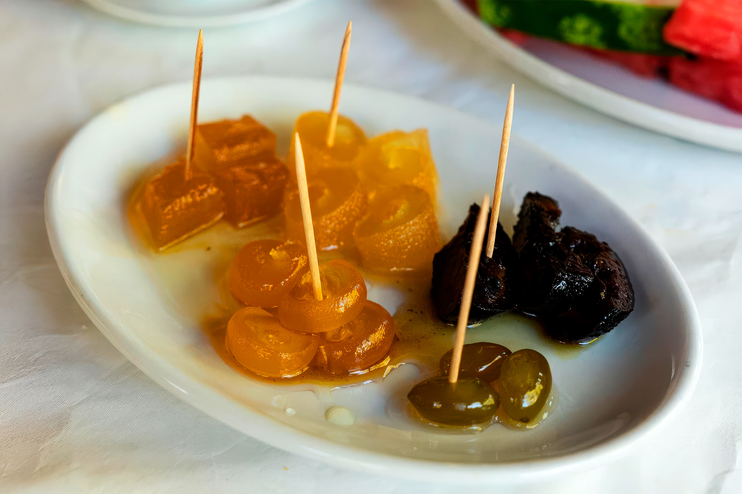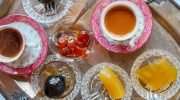 The most recognisable example is glyko tou koutaliou, or spoon sweets. Made by preserving fruit, peels, or nuts in sugar syrup, these sweets are served in small portions, traditionally on a single spoon with a glass of water. The ritual matters as much as the flavour. Offering a spoon sweet signals welcome, respect, and care.