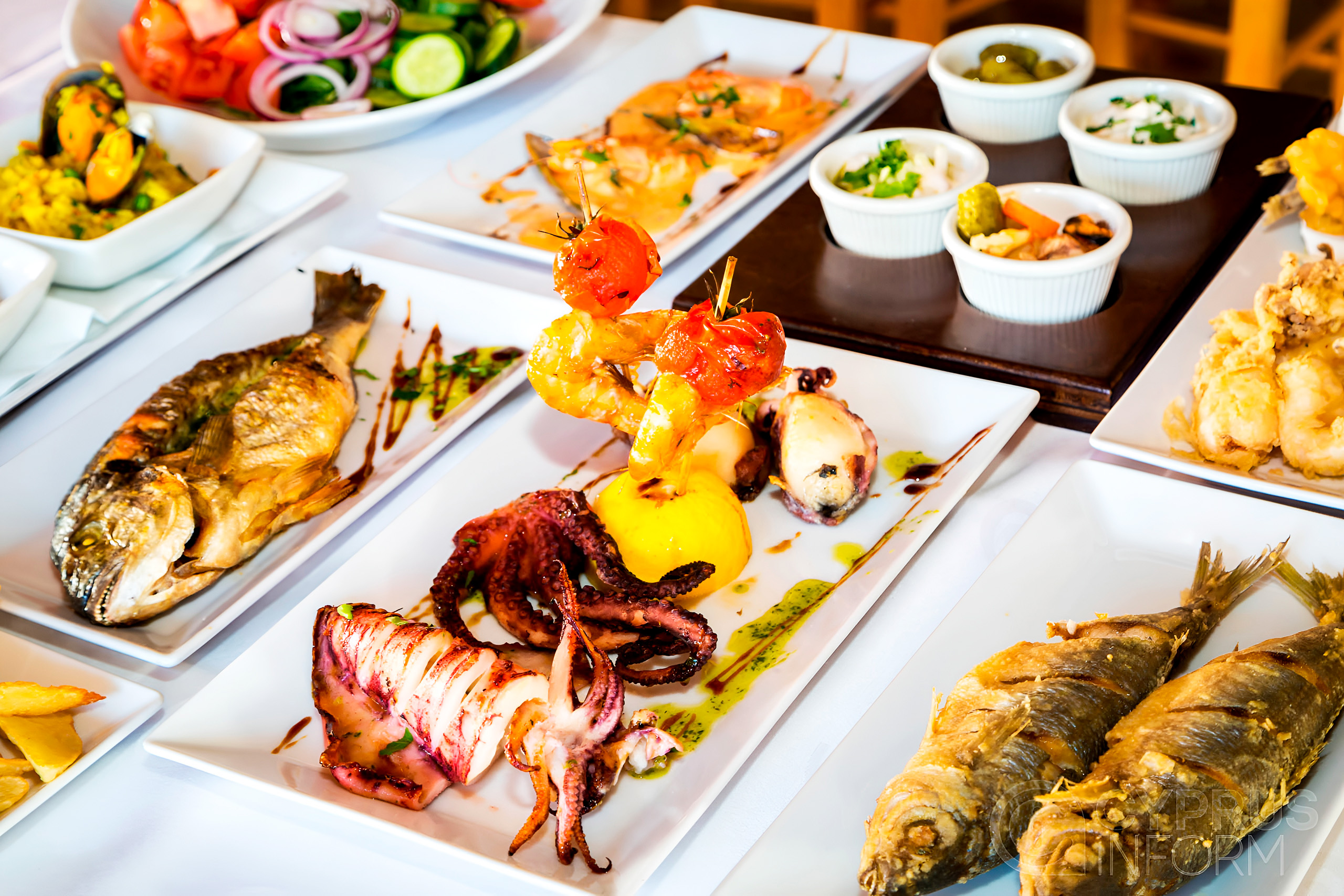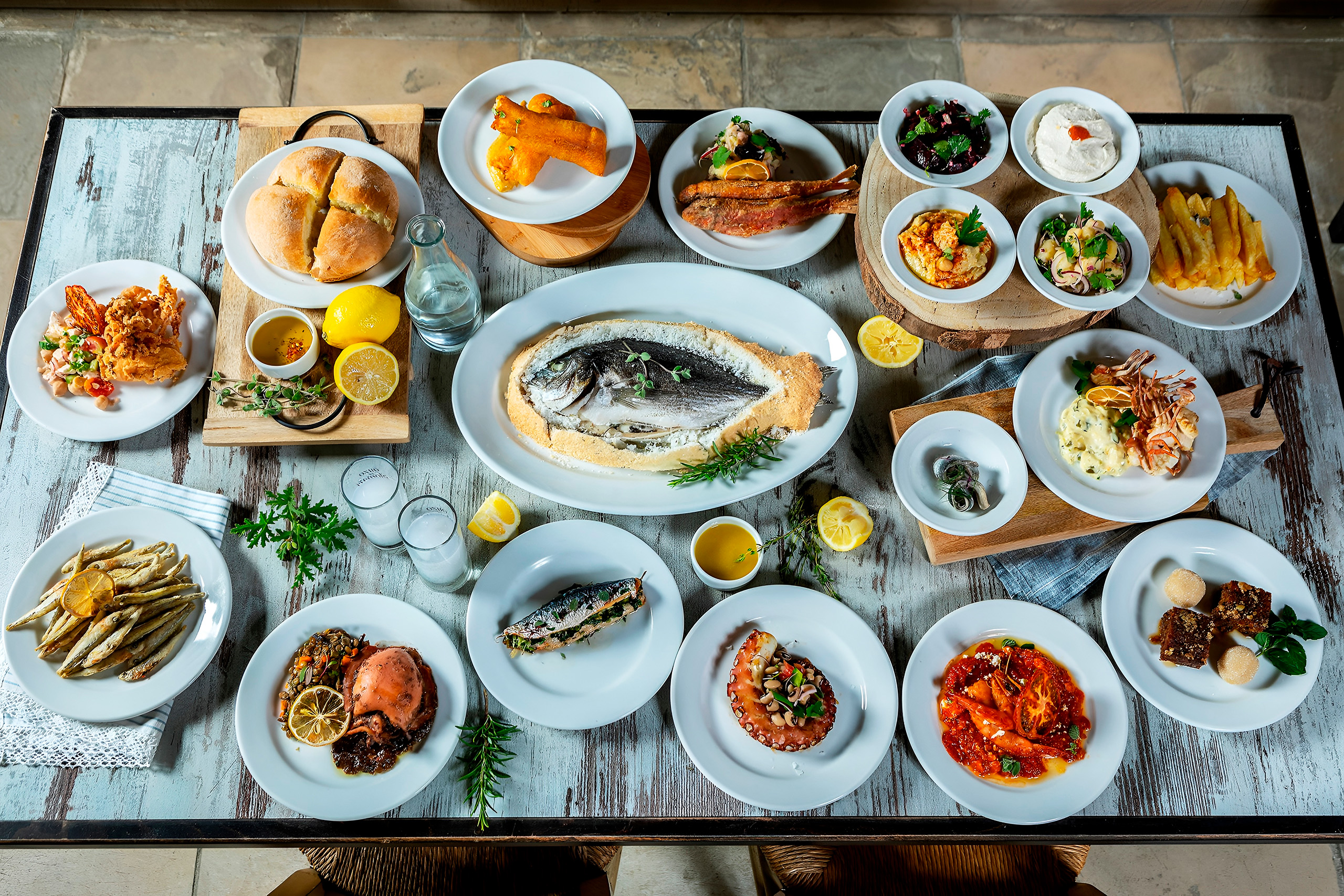The mezze experience represents Cypriot dining culture at its most authentic. A typical spread begins with black and green olives, tahini, hummus, taramosalata fish roe dip, skordalia potato and garlic dip, and tzatziki alongside fresh bread and salad. The middle courses bring grilled halloumi, lountza smoked pork loin, keftedes meatballs, sheftalia pork rissoles wrapped in caul fat, and loukaniko spiced pork sausages.