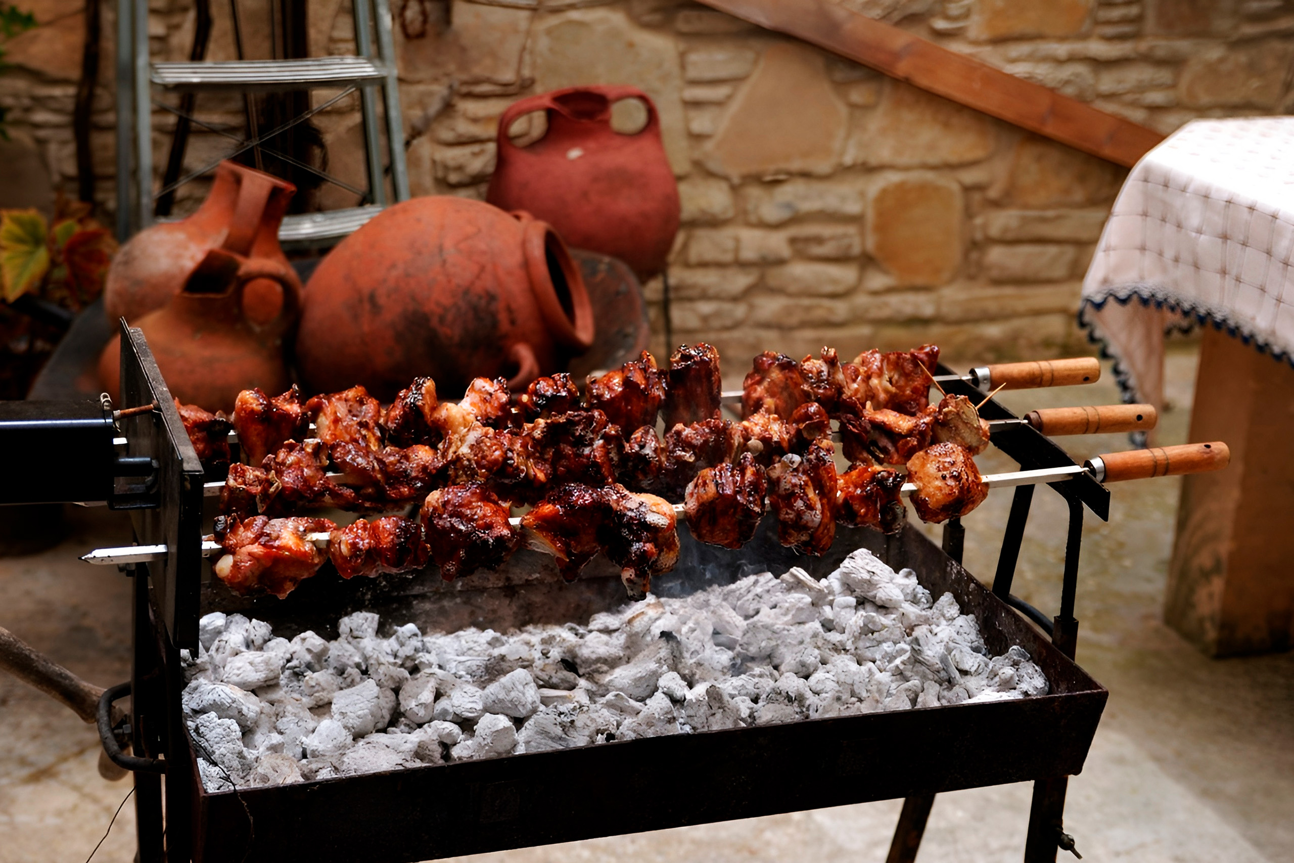 Unlike Greek souvlaki which uses smaller pieces, Cypriot souvla requires patience and scale, with whole communities gathering around large grills for celebrations. Afelia marinates pork in red wine and coriander seeds for up to two weeks before slow cooking, producing tender pieces with complex flavor that defines home cooking in the Troodos villages. Stifado braises meat with whole shallots and spices into a thick stew with Venetian roots.