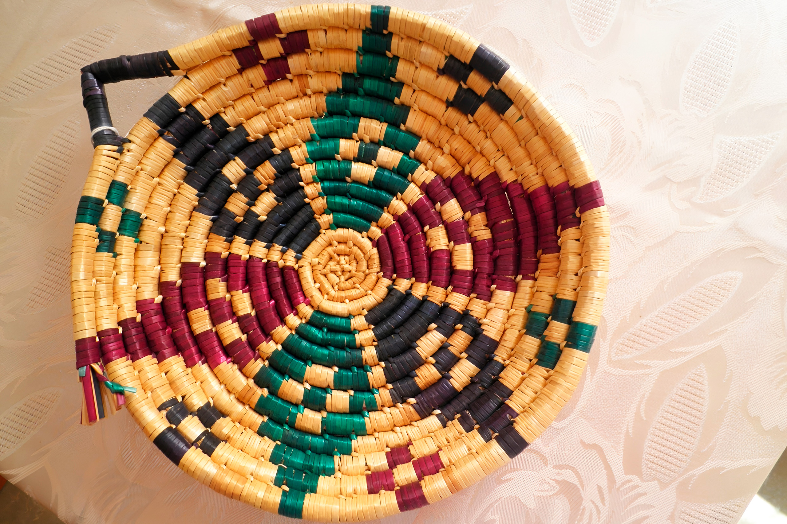The weaver can make very interesting and complex designs and patterns, which takes a lot of practice and patience to learn. Weavers color the straw with different vegetable colorings to make the various colored strands to weave from. Each weaver has their own way of working, creating intricate designs differently from other people. The baskets are made from a special kind of straw, which can also be used to make bread baskets and caskets with lids.