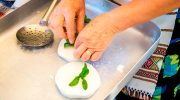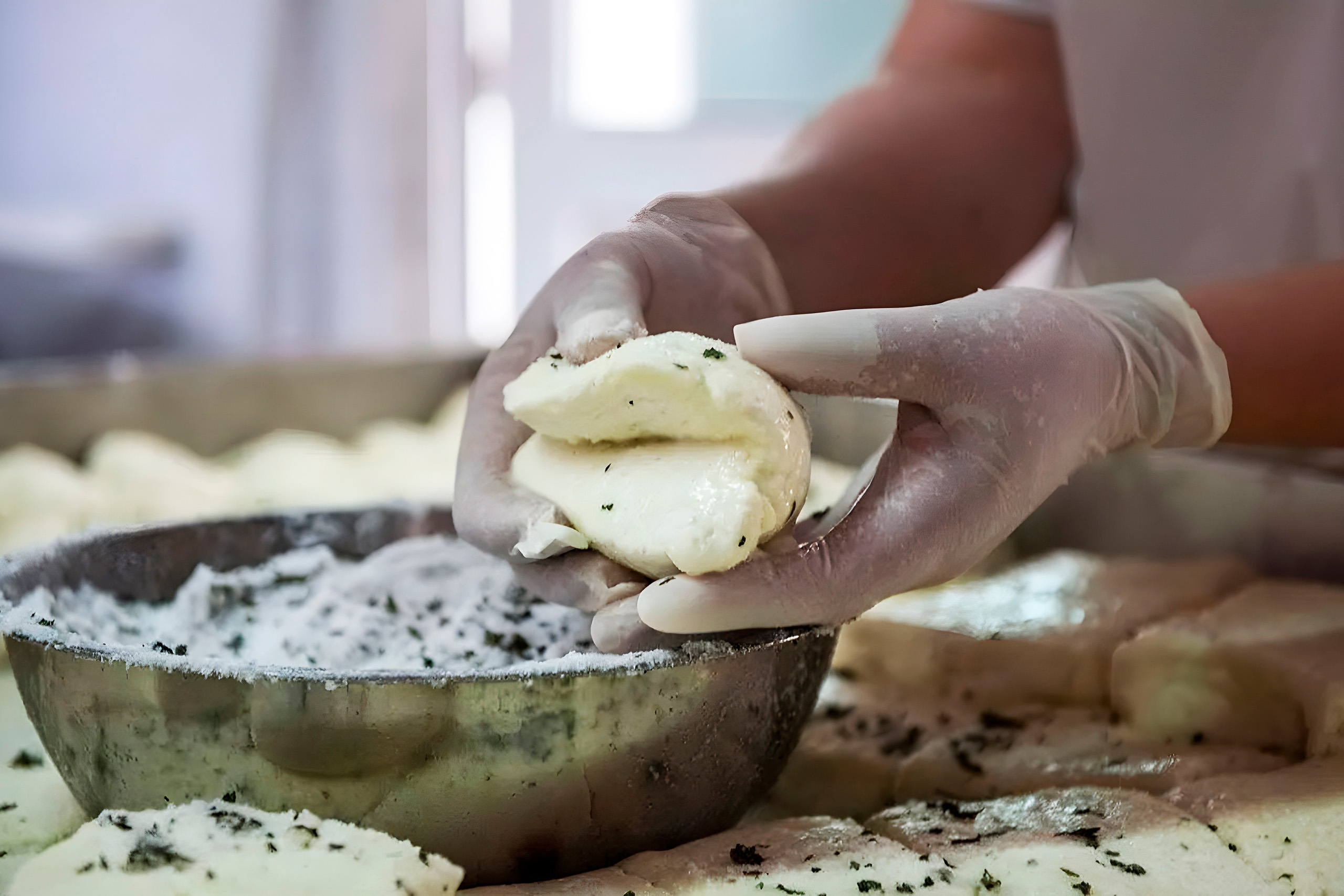 The cooked pieces are then removed from the whey and salted, and fresh or dried mint leaves are added before the pieces are folded and stored in salted whey for one to three days. For mature halloumi, the cheese must remain in brine for at least 40 days at temperatures between 15 and 20 degrees Celsius.
