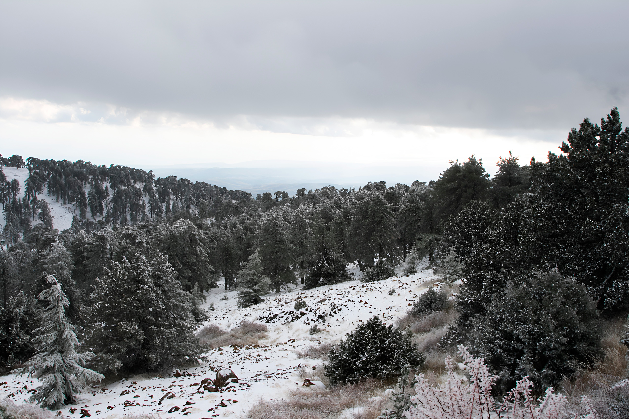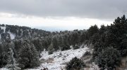 The highest part of Mount Olympos, above 1,500 meters, is covered by snow from January to April. This zone is characterized by sparse growth of Pinus nigra. The ground beneath the pines is covered with a variety of plants, many of which are endemic: Alyssum cypricum, Alyssum troodi, Arabis purpurea, Crocus cyprius, Euphorbia veneris, Nepeta troodi, and Onosma troodi.