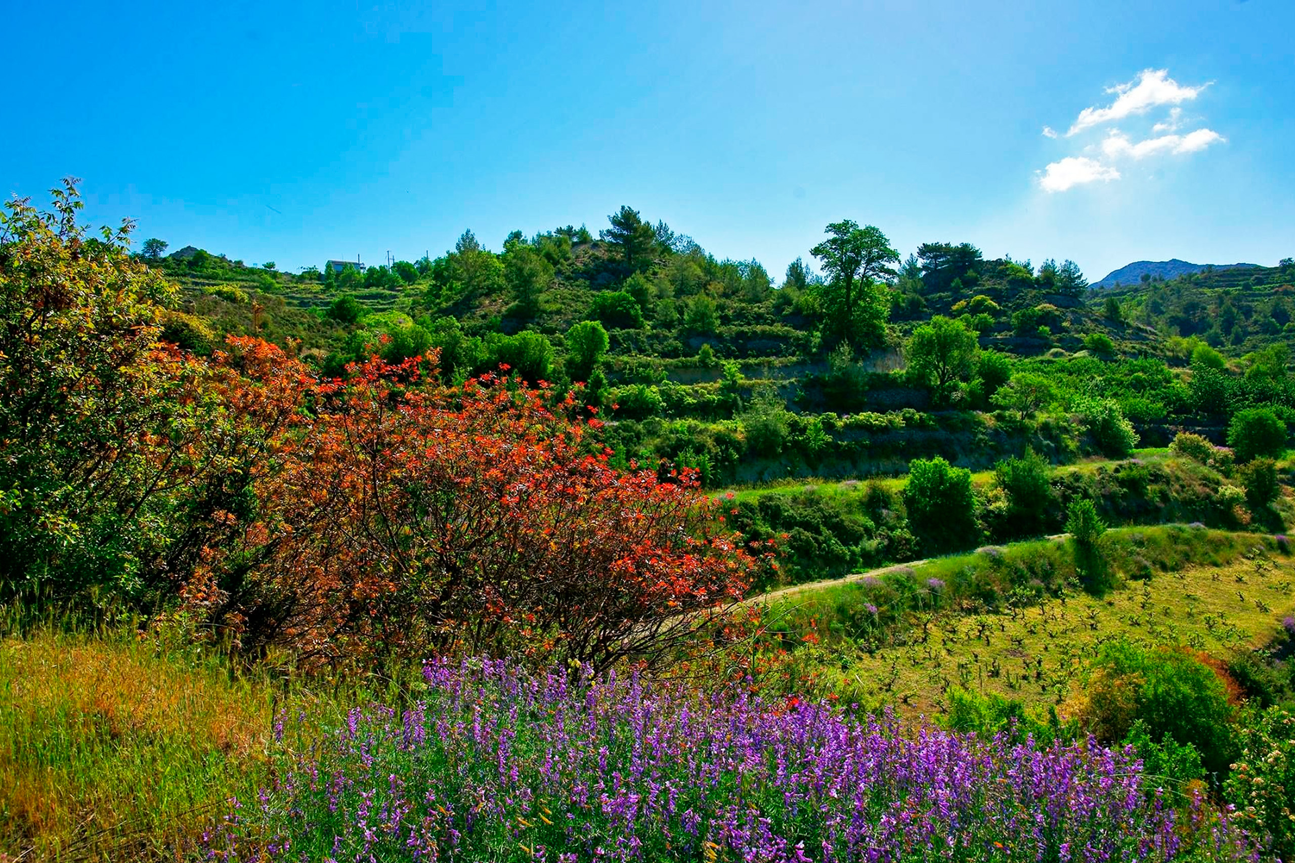 The Pitsillia area lies on the eastern slopes of the Troodos mountain range. Picturesque villages cling to the mountainside amid vineyards, orchards of almond and hazelnut trees, and an astonishing array of wildflowers. The need for agricultural land led for many centuries to the clearing of forested areas. Vineyards and orchards replaced pine forests in suitable locations.