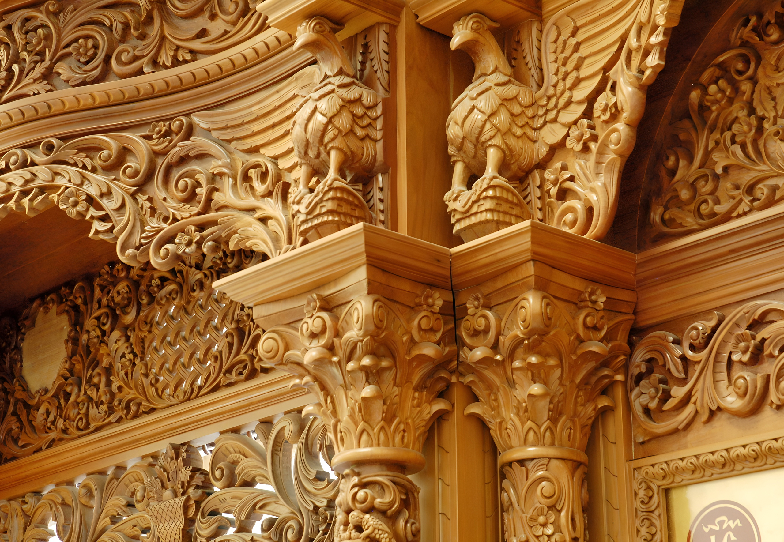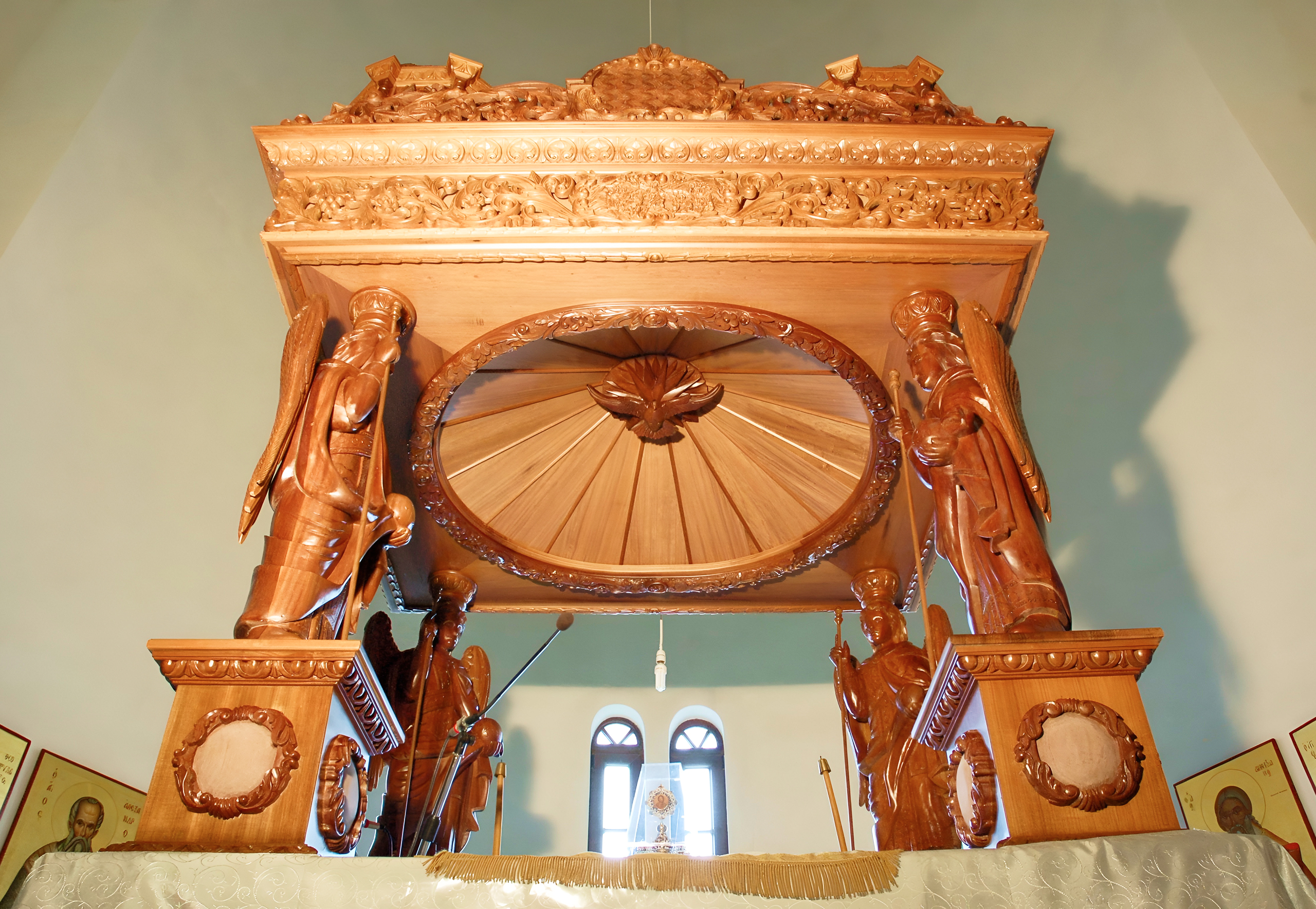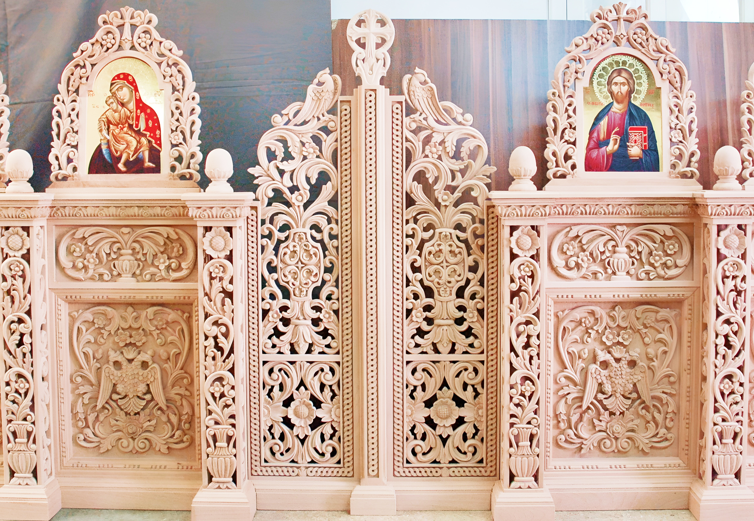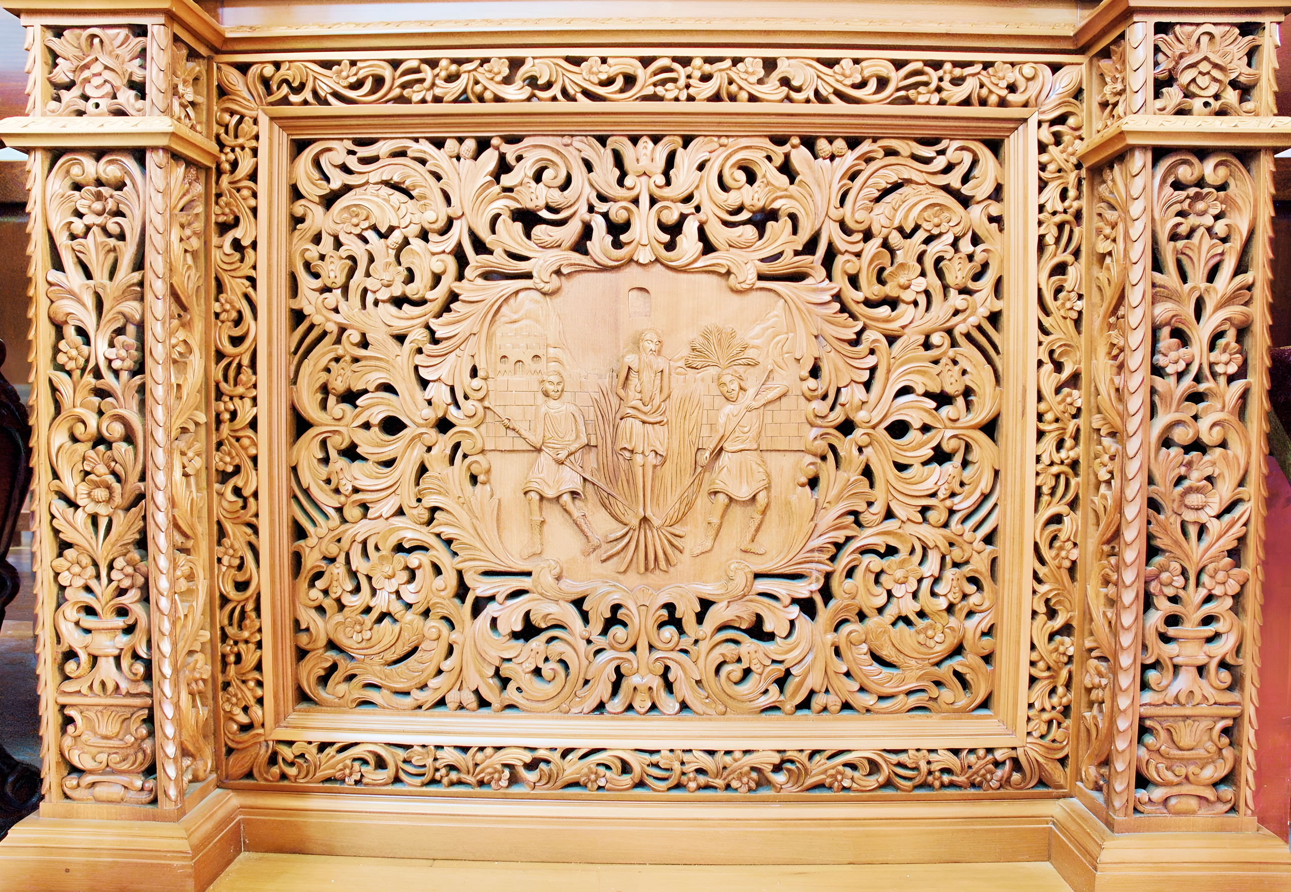 Cypriot woodcarving used local cypress for durability and olive for symbolism (eternal peace), carved with tools like gouges and mallets for precision. Iconostases, tall screens with tiers of icons, featured carved frames with vines for life or pelicans for sacrifice, as in 15th-century examples from Pedoulas. Pulpits, elevated for visibility, had panels with evangelist symbols – lion for Mark, eagle for John – enhancing sermons.